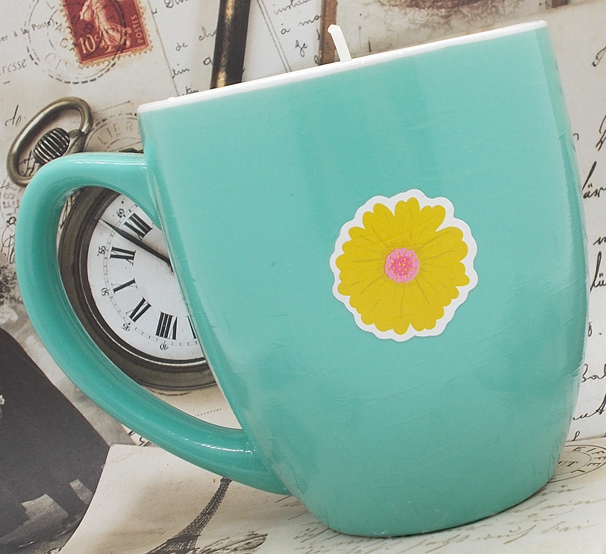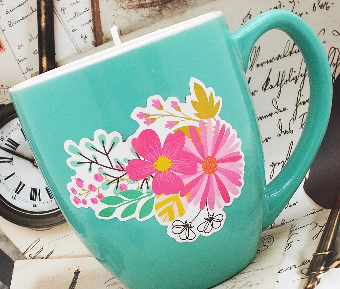 Vela artesanal de parafina em caneca de cerâmica decorada à mão