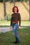 Esta camisola é tricotada de cima para baixo sem costuras. Começamos por tricotar o ombro esquerdo, depois o ombro direito e unimos as peças para formar o decote e terminar de tricotar a peça da frente. As costas são tricotadas do mesmo modo, mas sem decote. Nas cavas as peças são unidas e tricotamos em circular até ao final do corpo. O cós do corpo é tricotado num ponto rendado e com uma cor contrastante. As mangas começam com malhas apanhadas na cava e são tricotadas em circular até ao punho.