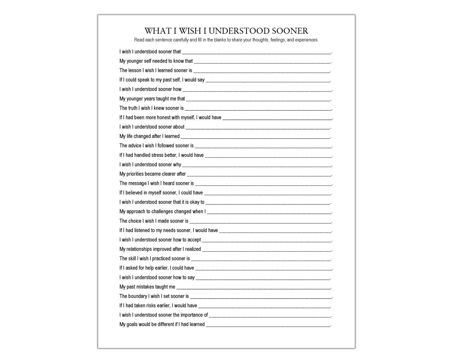 Life has a way of teaching us lessons right when we need them, but looking back can be incredibly healing. This What I Wish I Understood Sooner worksheet features 30 prompts to help you slow down and acknowledge the shifts in your thinking that changed everything. Use it for therapy sessions, journaling, or self-reflection to celebrate the “clicks” and “lightbulbs” that have happened along your path. Look back, smile, and keep moving forward.