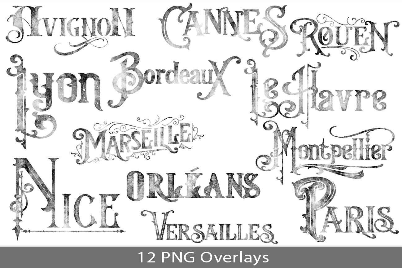 French city names, distressed overlays, PNG (RY15)