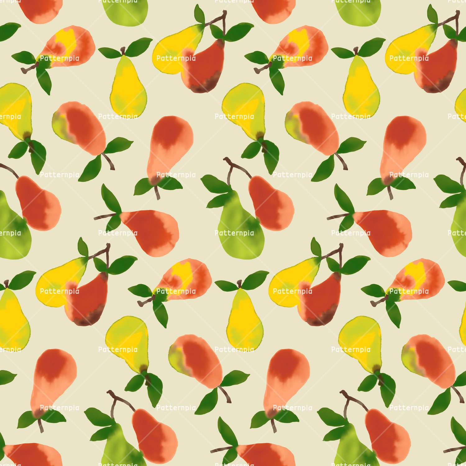 Charming hand-painted pears in vibrant red, yellow, and green tones on a soft cream ground.