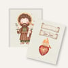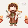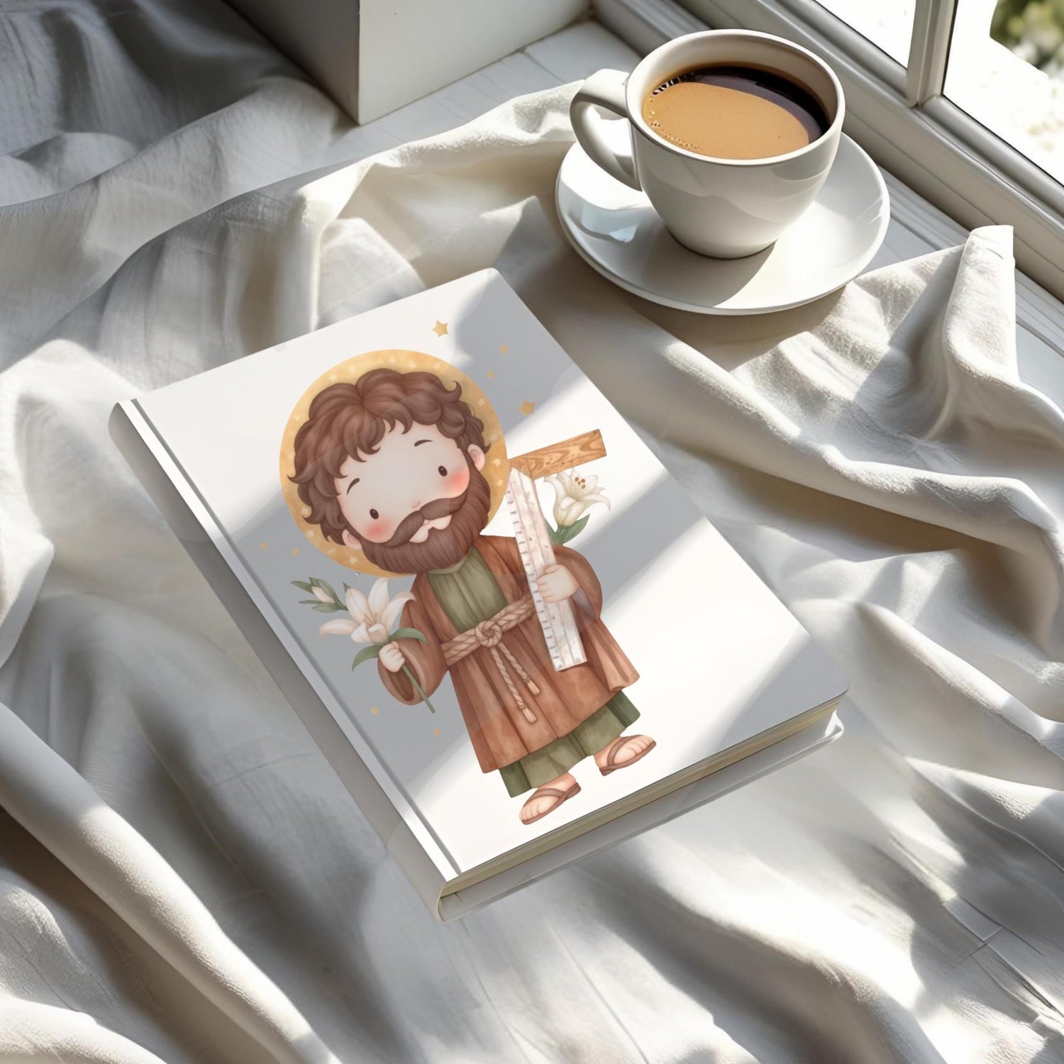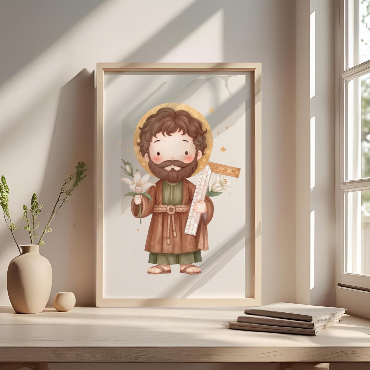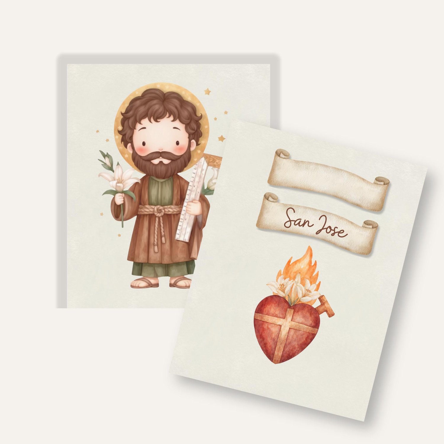 1x Ilustración principal de San José Obrero: La imagen del santo con sus herramientas de carpintero, en un estilo dulce y moderno. Ideal para estampitas, oraciones, recordatorios y más.