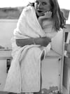 I highly recommend Tahki’s Montana yarn or another Super Bulky, pencil-roving-type yarn. It creates a lofty, cozy, wrap that shows off the Chevron pattern nicely. The undyed wool in the sample keeps the focus on the stitch pattern.