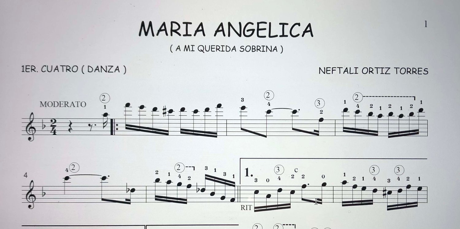 Partitura de 1er Cuatro de la composición de Neftalí Ortiz: María Angélica.