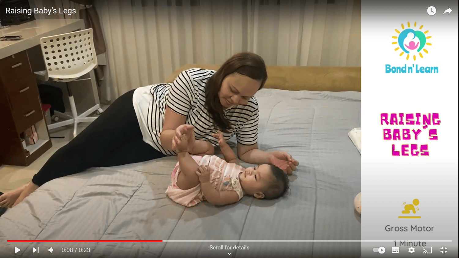 While baby is lying down flat, get both your baby’s feet on your hand, then gently raise their legs. This will stretch and exercise their hip and leg muscles, in preparation for crawling and other gross motor activities.