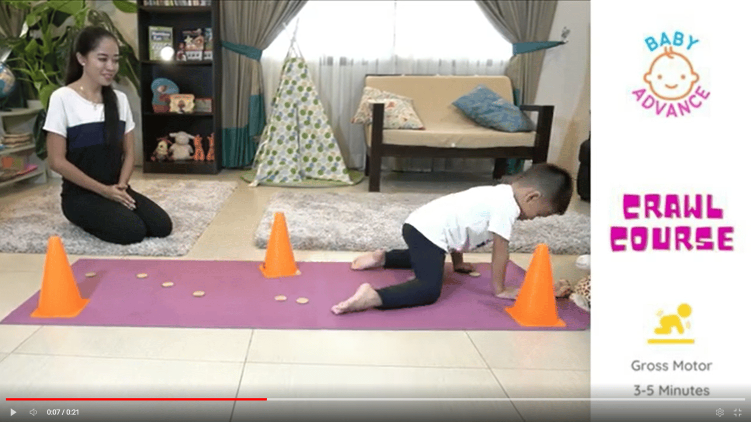 Design a crawl course with guides, such as cones, that your child can easily follow. This activity will promote the development of your child’s gross motor skills, and teach them to follow directions.