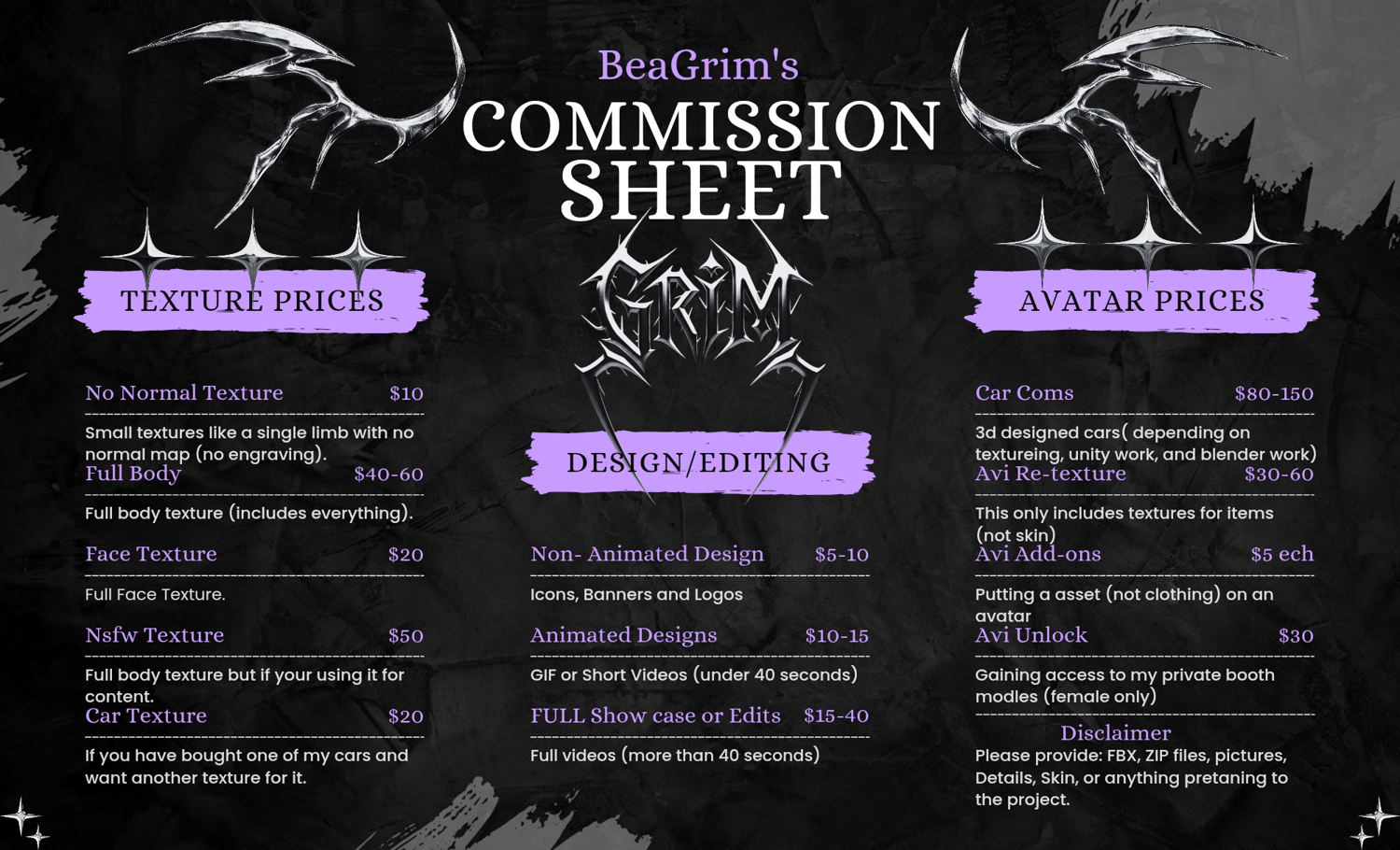 Welcome to GRIM, we offer custom avatars of any kind, we sell our own avatars, textures, assets, and effects. we also offer graphic design commissions as well for any need. Feel free to look or contact us for more.