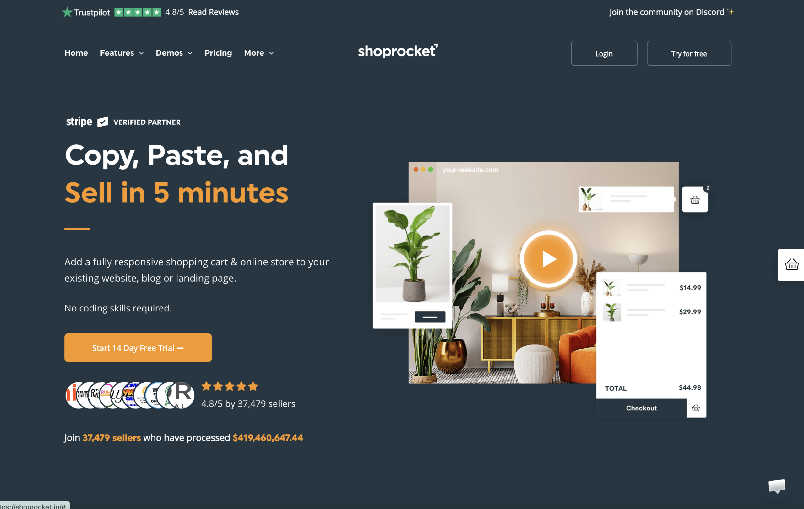 Shoprocket Sellers embedding checkout into existing websites $29–$199/month Works with your own site, instant payouts Not all-in-one, requires technical setup, limited features Best for embedded selling