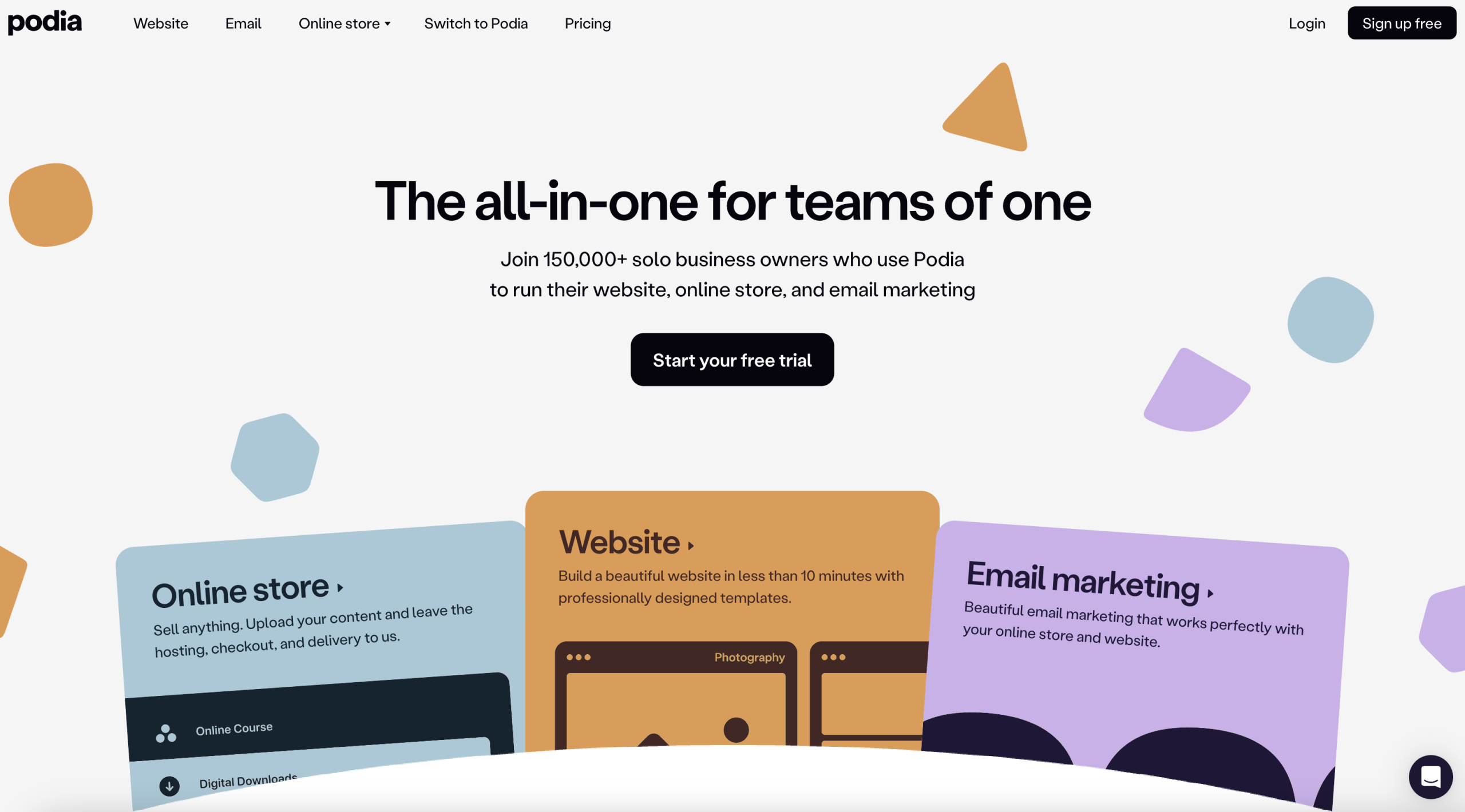 | Podia | Course creators, digital downloads, coaching, webinars, communities | Mover: $33/month + 5% fee Shaker: $75/month |