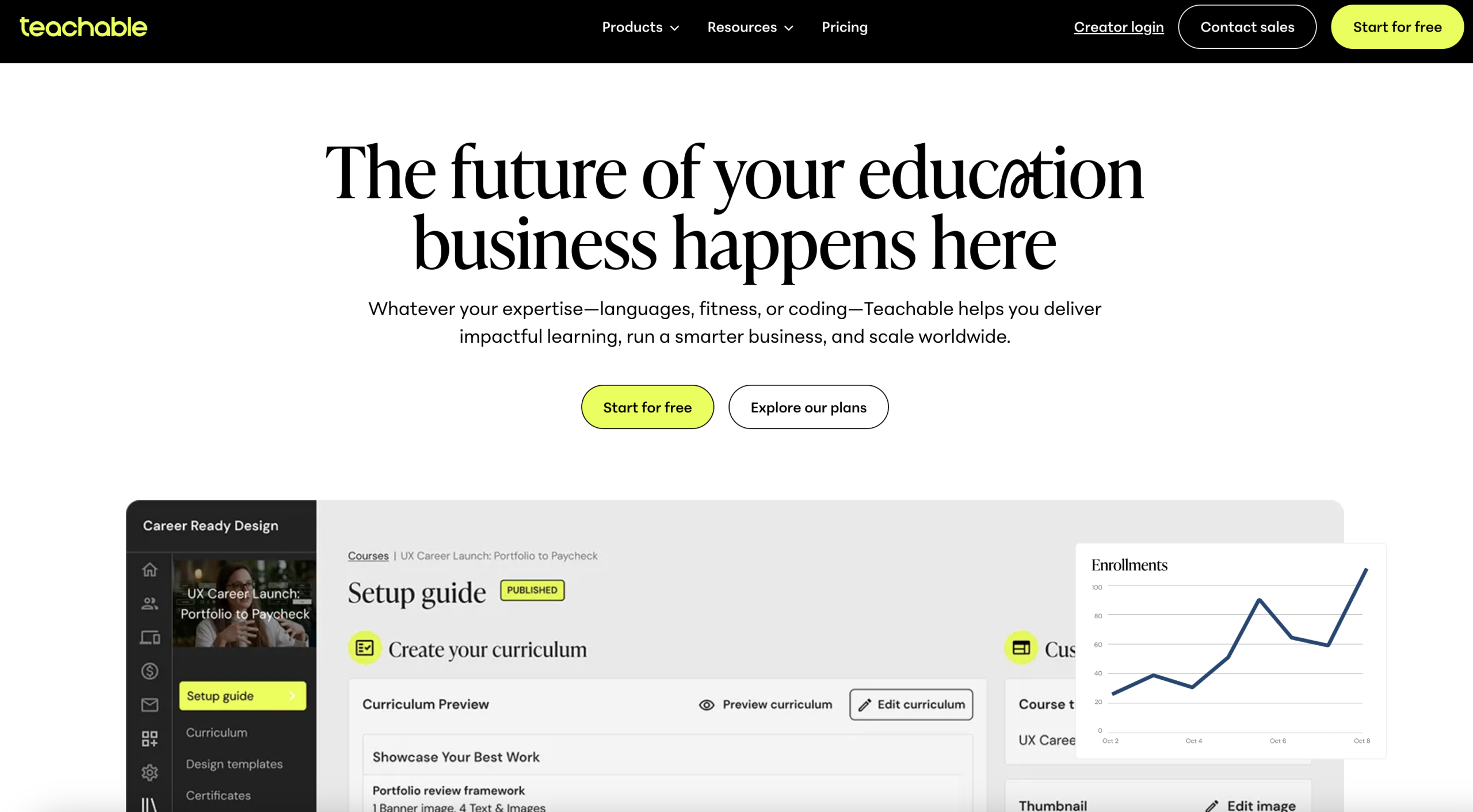 | Teachable | Creators focused only on online courses | Starter: $39/month + 7.5% fee Builder: $89/month Growth: $189/month |