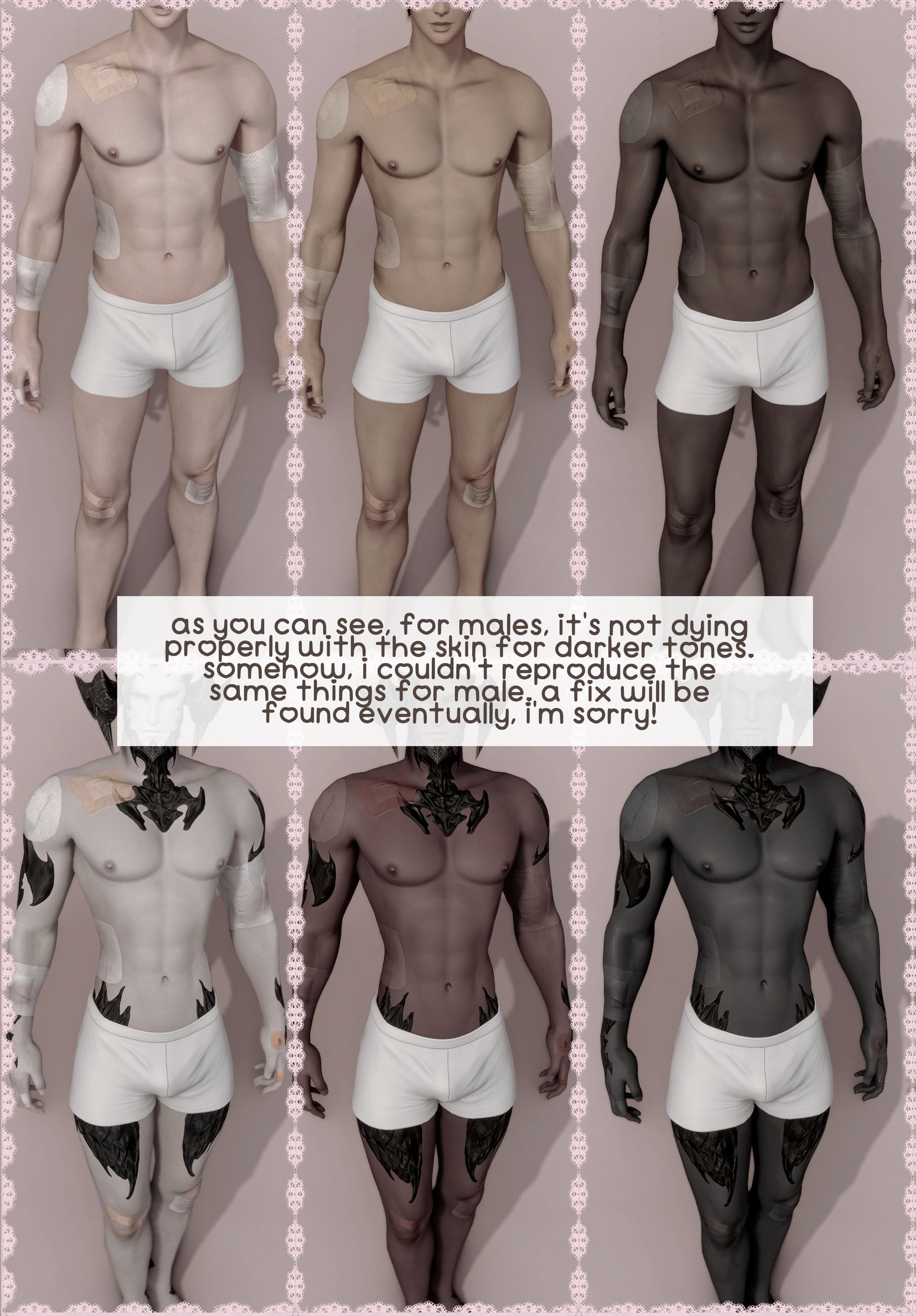 • IMPORTANT. on male version only, the normal map will dye with your skintone. it's not a problem for lighter characters, but for darker, it won't look as intended and will dye with the skintone instead of having their own colour. You can check how it looks through demos and also the previews I took.