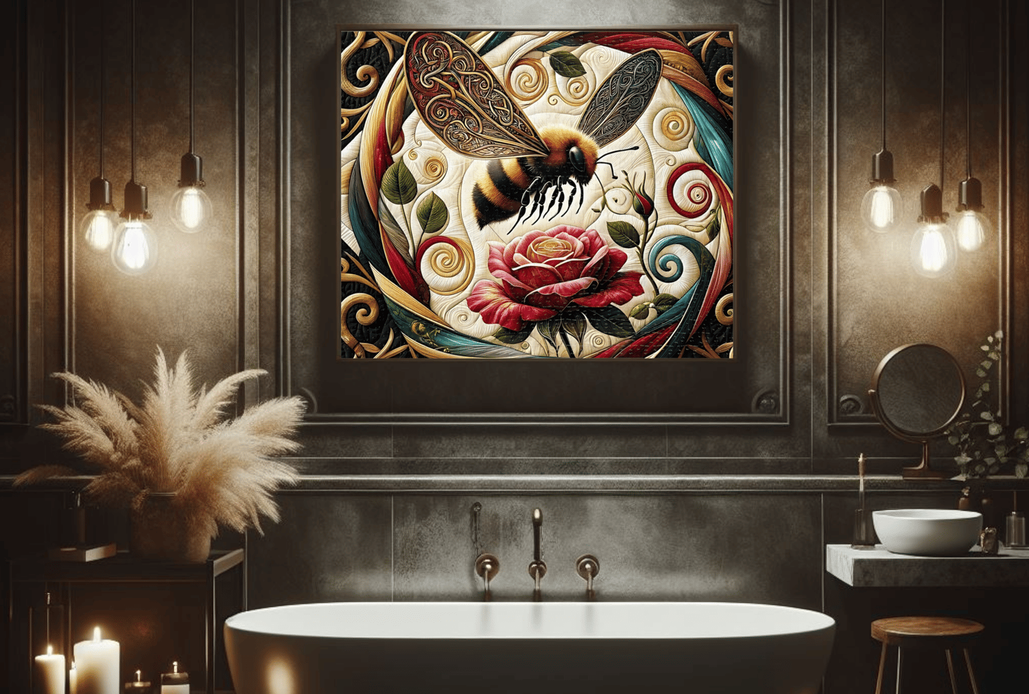 Step into a baroque fantasy with "Apotheosis of Aroma The Bumblebee Ballet Puzzle," an artful jigsaw puzzle that comes in a choice of 1000 pieces for a truly immersive experience or 500 pieces for a more casual endeavor. At the center of this opulent composition is a velvety rose, layered in tones of blush and cream, embodying the sublime beauty of nature's creations. A plump bumblebee with intricately patterned wings, each vein a testament to the artistry of life, hovers above in a dance as old as time. Surrounded by a cornucopia of spiraling leaves and scrollwork,.