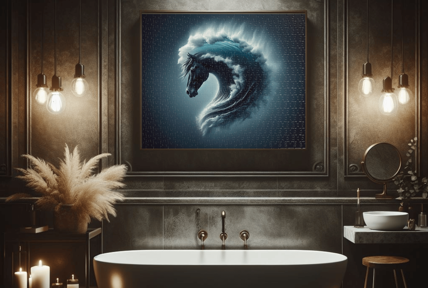 This puzzle beckons you into a dreamlike realm where the might of Neptune, the god of the sea, takes form in a noble steed. Emerging from the depths, the horse's head is cradled by a crescent wave, its mane a flowing extension of the water's frothy tendrils. Set against a dusky, star-speckled sky, the scene evokes the mystery of a lunar eclipse where darkness and light play across the canvas of the ocean.