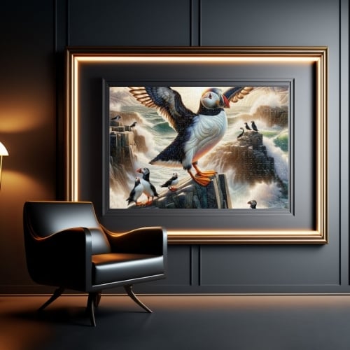 "Crest of Harmony the Puffin’s Flight" is a breathtaking puzzle that soars in a 1000-piece expanse and glides in a 500-piece collection, capturing the essence of the cliffside's feathered inhabitants. In this vivid depiction, a puffin with wings outstretched takes center stage, embodying the spirit of freedom and the rhythmic dance of the sea and sky.