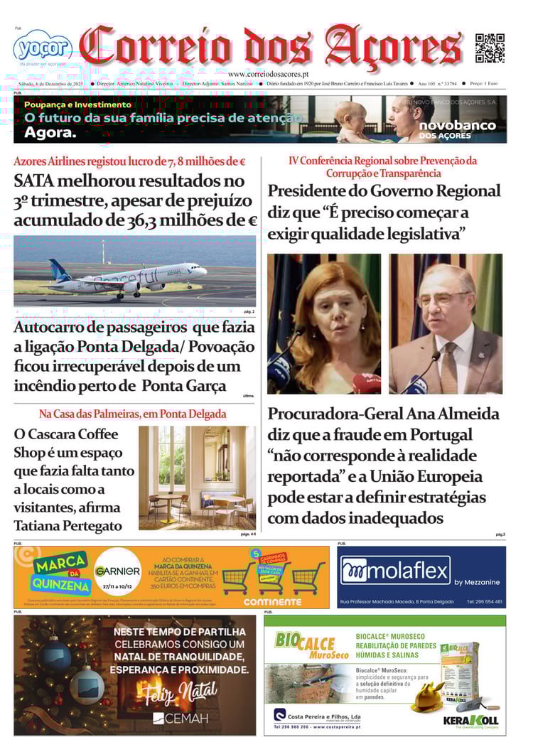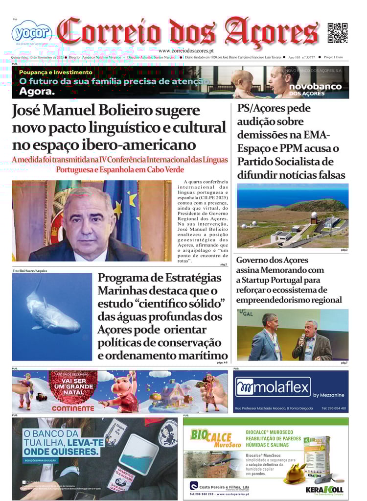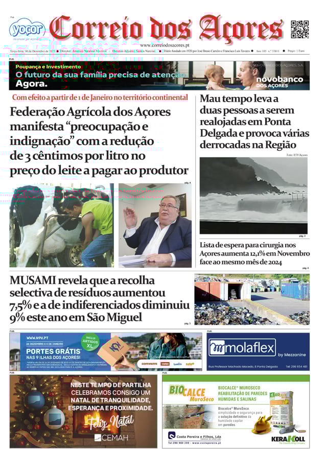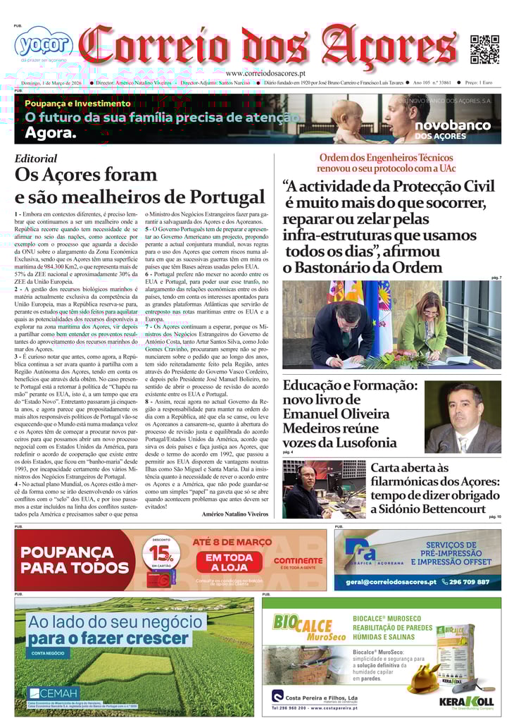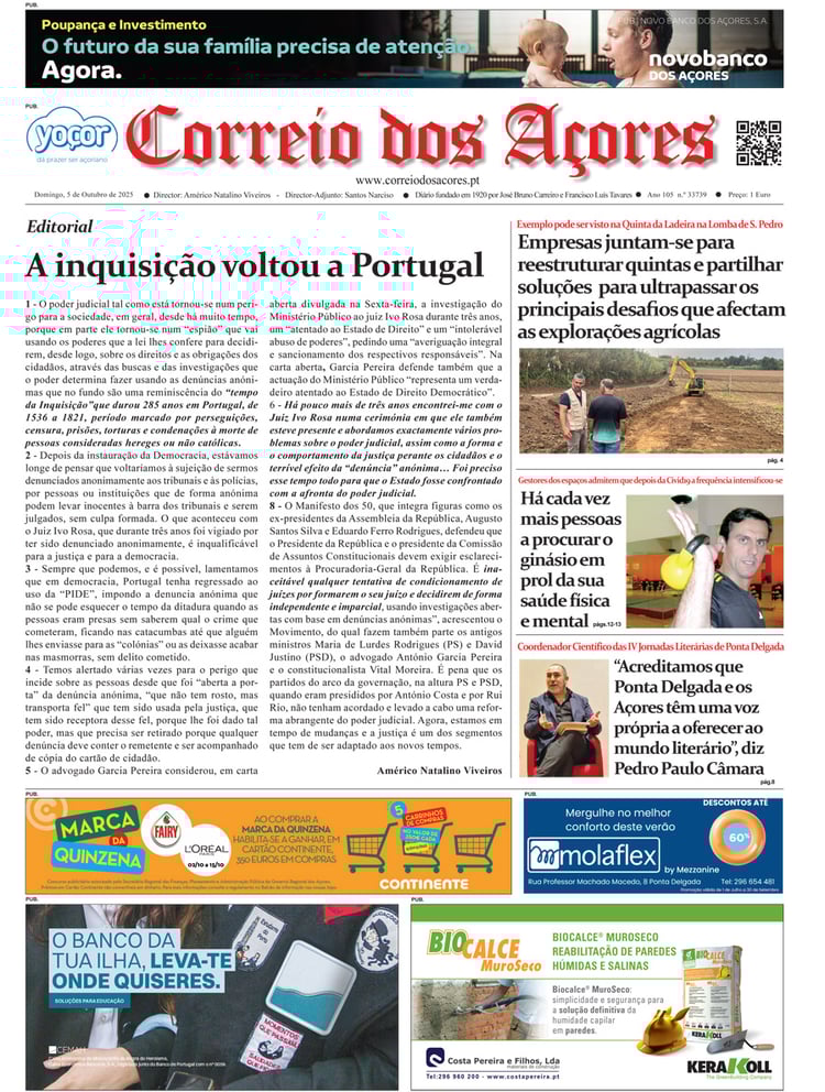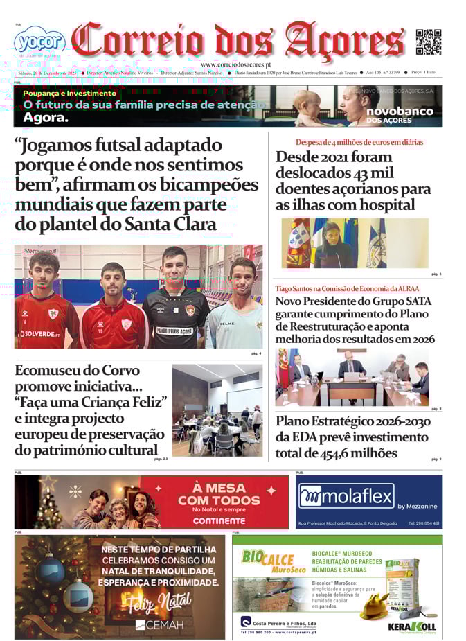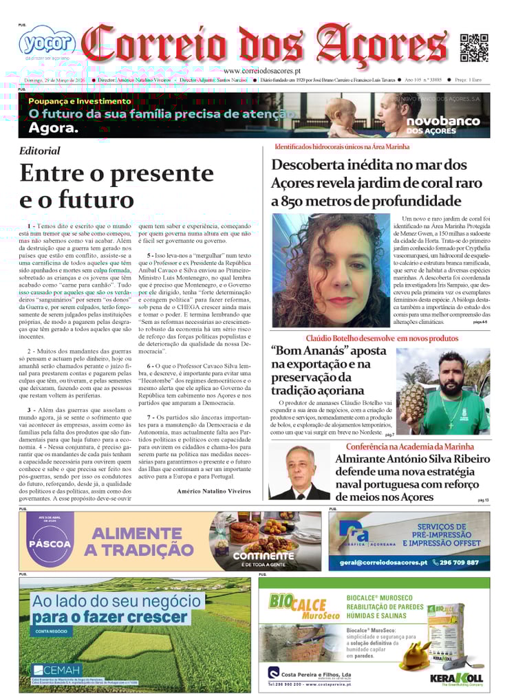 Tal como há um século, o jornal Correio dos Açores defronta-se agora com uma sociedade amedrontada. Mas este é o tempo de calcular os excessos e a vertigem que formatou as duas décadas deste milénio, e redirecionar a bússola do futuro na busca do equilíbrio que faltou nas lideranças dos países, e nos consequentes comportamentos sociais, económicos e culturais.