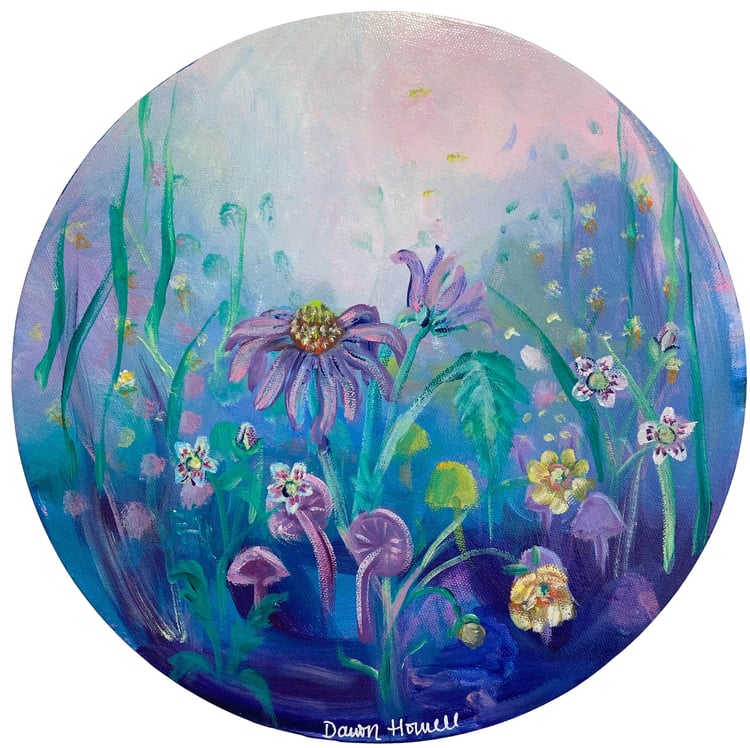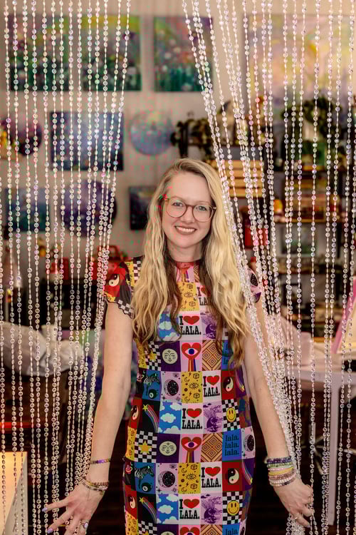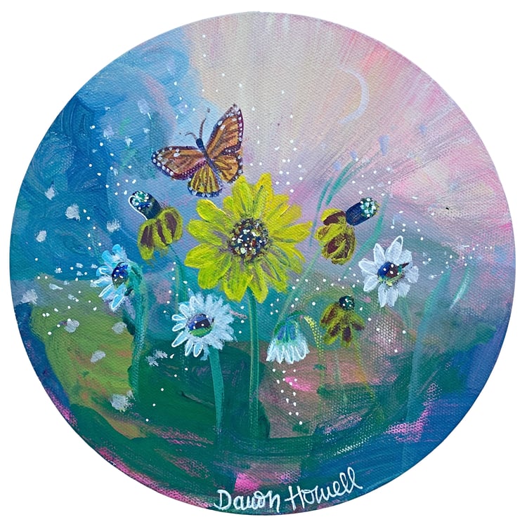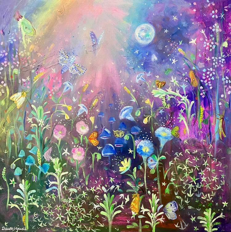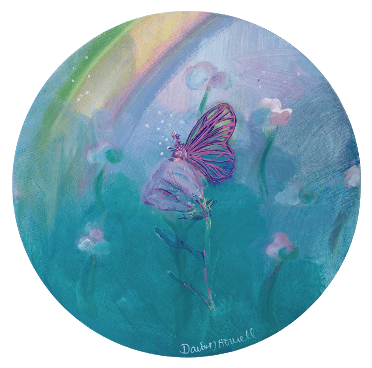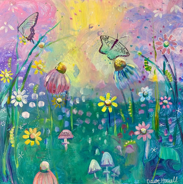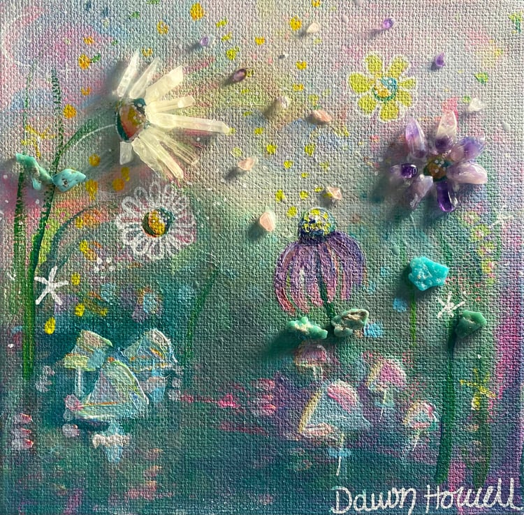 Dawn Howell is a Texas-based artist whose whimsical, color-drenched paintings are created to heal the inner child and uplift the soul. Rooted in nature, nostalgia, and emotional memory, her work blends dreamy imagery with intentional earth energy — many pieces incorporating real crystals and minerals like selenite, amethyst, and mica that carry healing properties into the work itself.