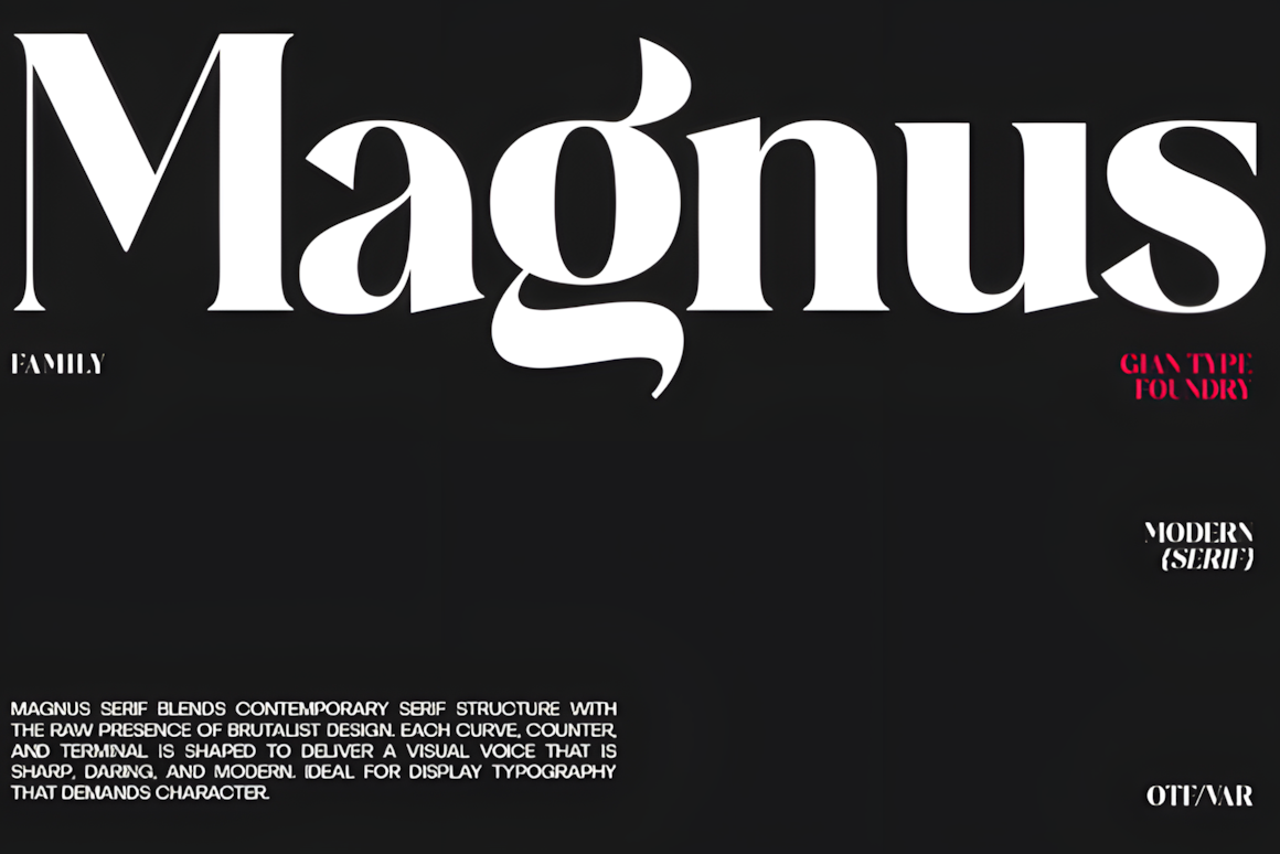 Magnus Serif is a bold display font where brutalist sharpness meets high-fashion elegance—high-contrast strokes create rhythmic impact perfect for luxury editorials and commanding brand visuals.