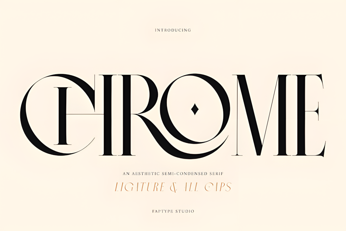 Chrome is a sleek semi-condensed serif where elegance meets versatility—captivating uppercase forms elevate every project with refined, aesthetic precision.