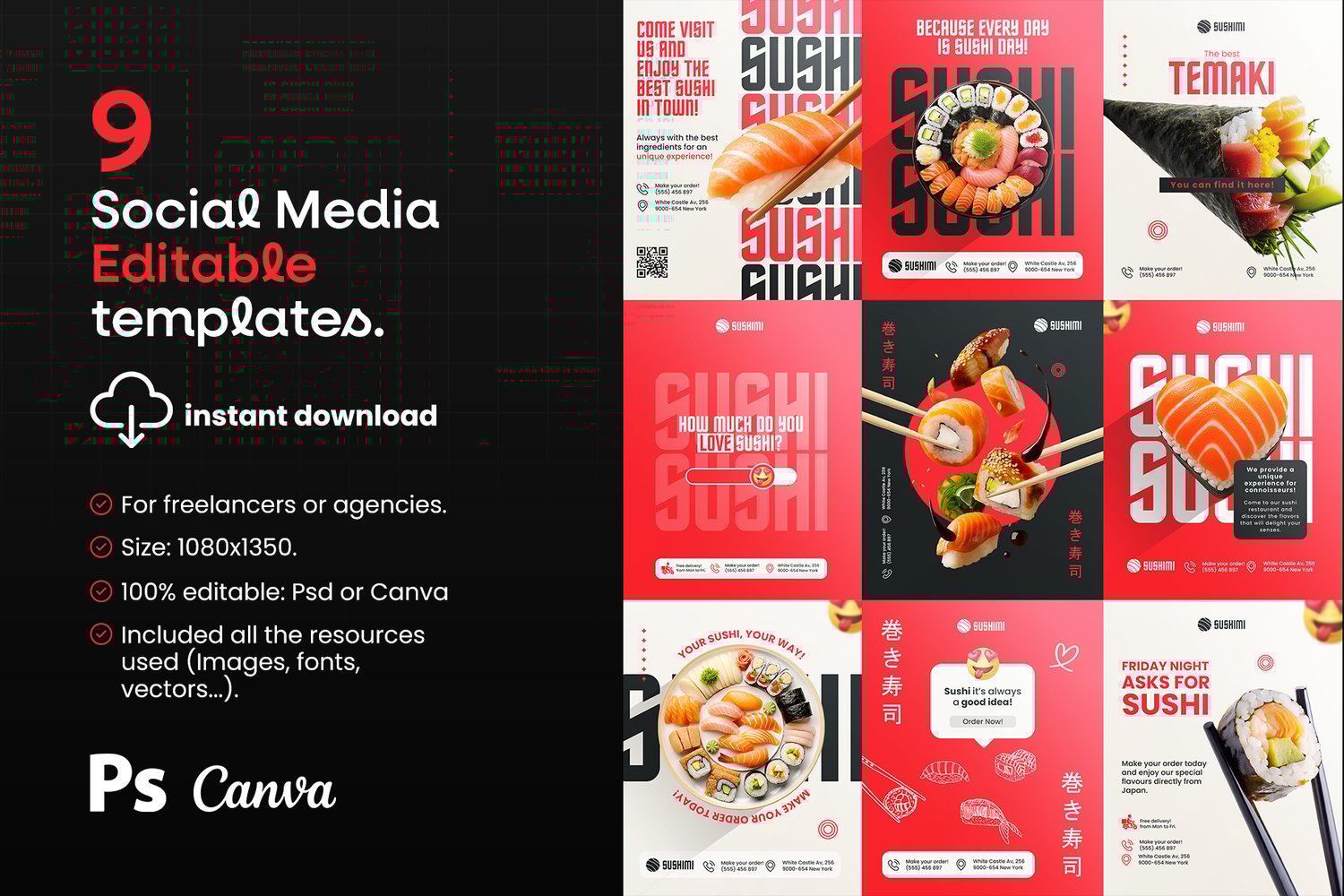 Social Media – Sushi Restaurant (Editable PSD + Canva Templates) + Extra Resources