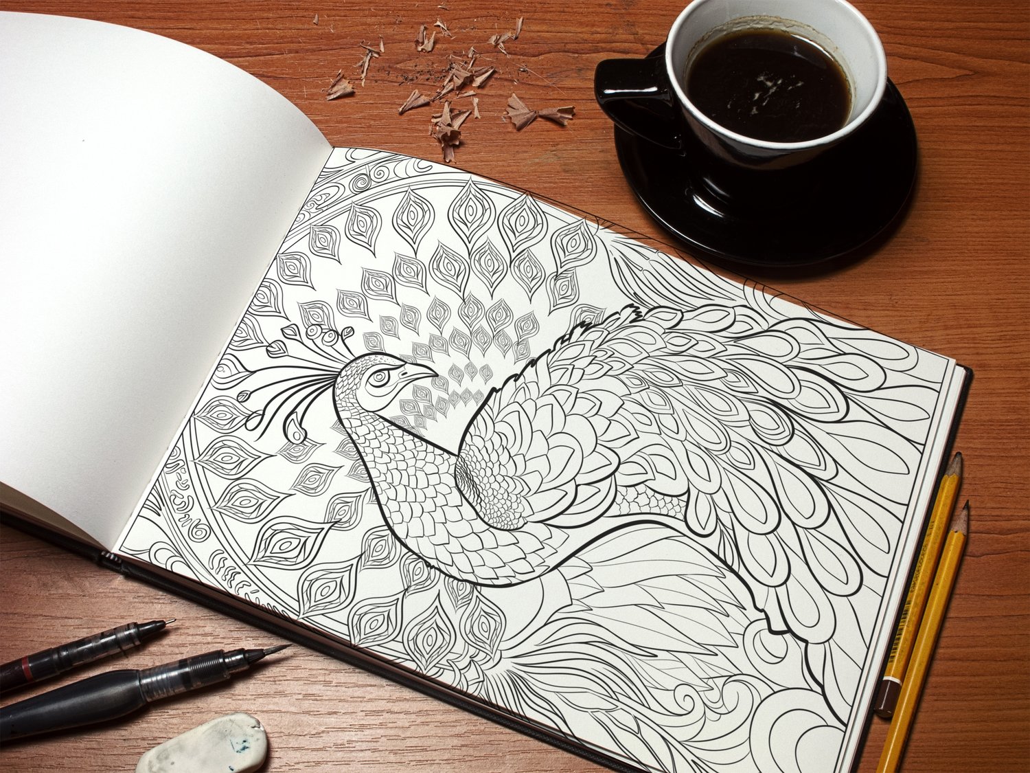 • Hand-drawn, elegant linework with soothing patterns, nature motifs, and sacred geometry