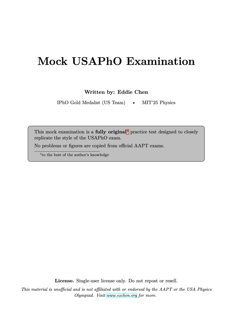I'm Eddie Chen, a physics graduate from MIT. I won an IPhO Gold Medal representing the US Team in 2021, and was a perfect scorer on the F=ma exam. I want to share my insights with the physics olympiad community. Contact me at ezchen@mit.edu, especially for questions or requests for anything at all.