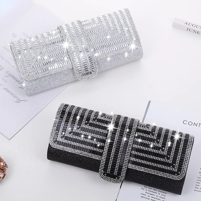 Women Evening Clutch Bag Diamond Sequin Wedding Clutch Purse Handbag Party Banquet Black Gold Silver Two Chain Shoulder Bag