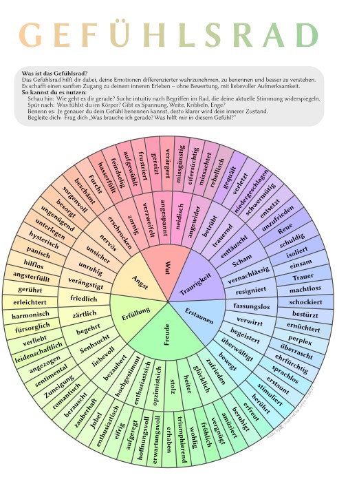 At the same time, I would like to use the money to print stickers with my emotional wheel and distribute them at university, in my private environment and, via a friend, in a residential child and youth welfare centre. Because there is so much need for people to engage more with their feelings and I hope that this will also create a basis for dialogue, so that people can finally start to talk more openly about their feelings. And I would be incredibly happy if you would support me on this journey.