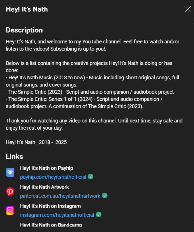 The banner at the top of the Hey! It's Nath Payhip page has been updated. Now, the current logo appears front and centre and there are also tributes or, if that word is incorrect, references to previous creative projects including Hey! It's Nath Mus...