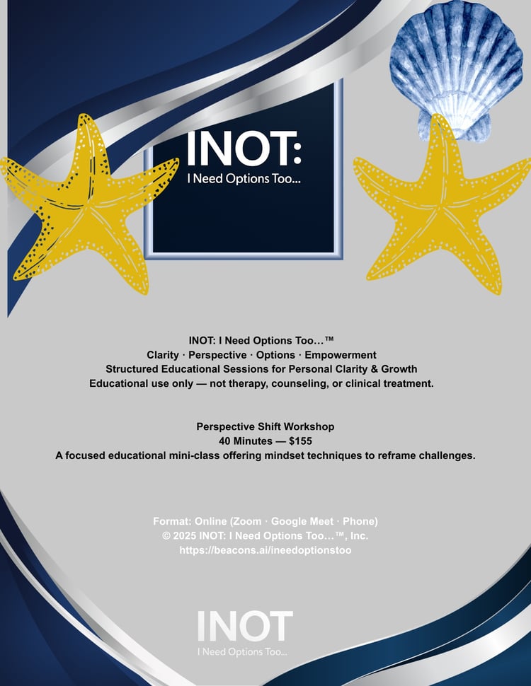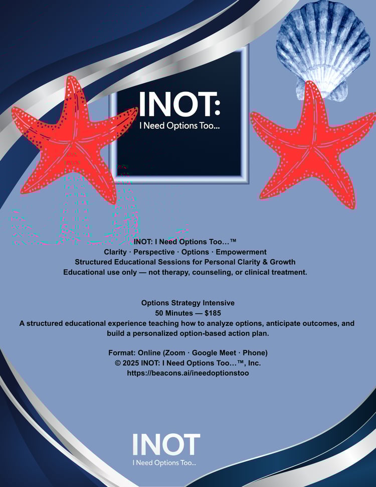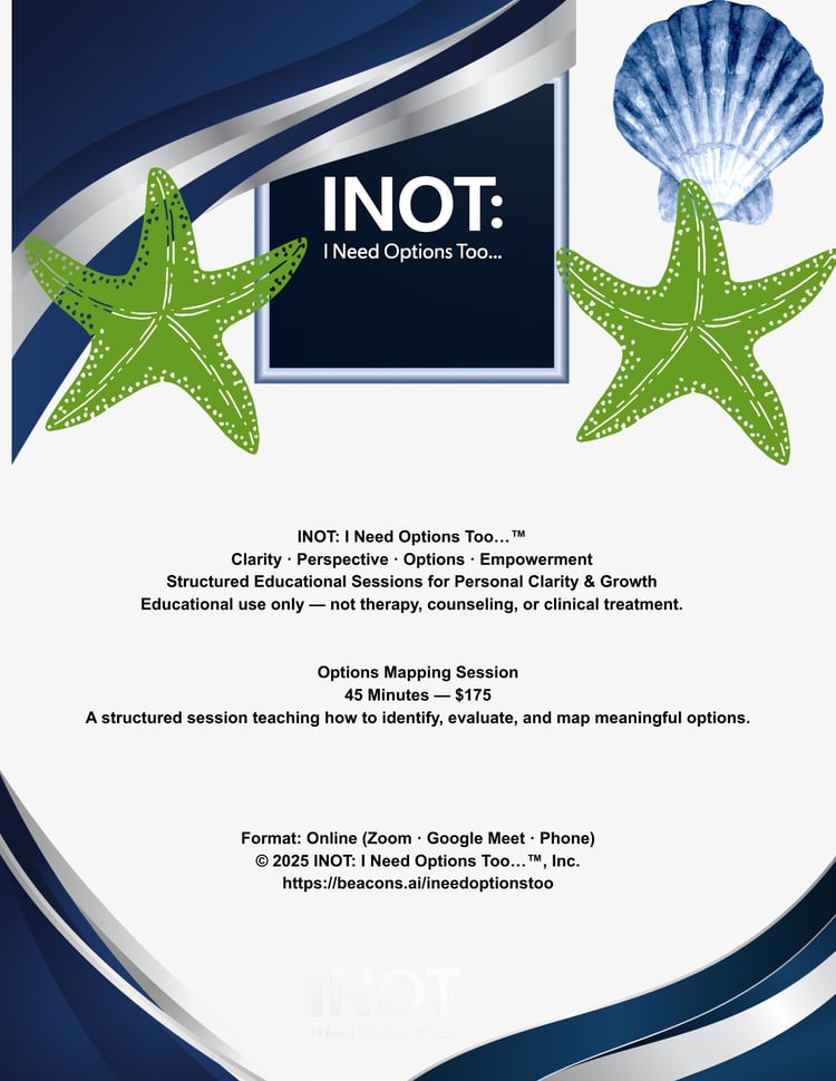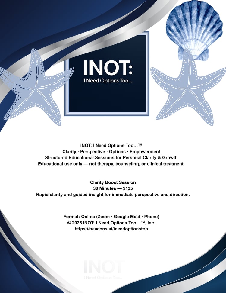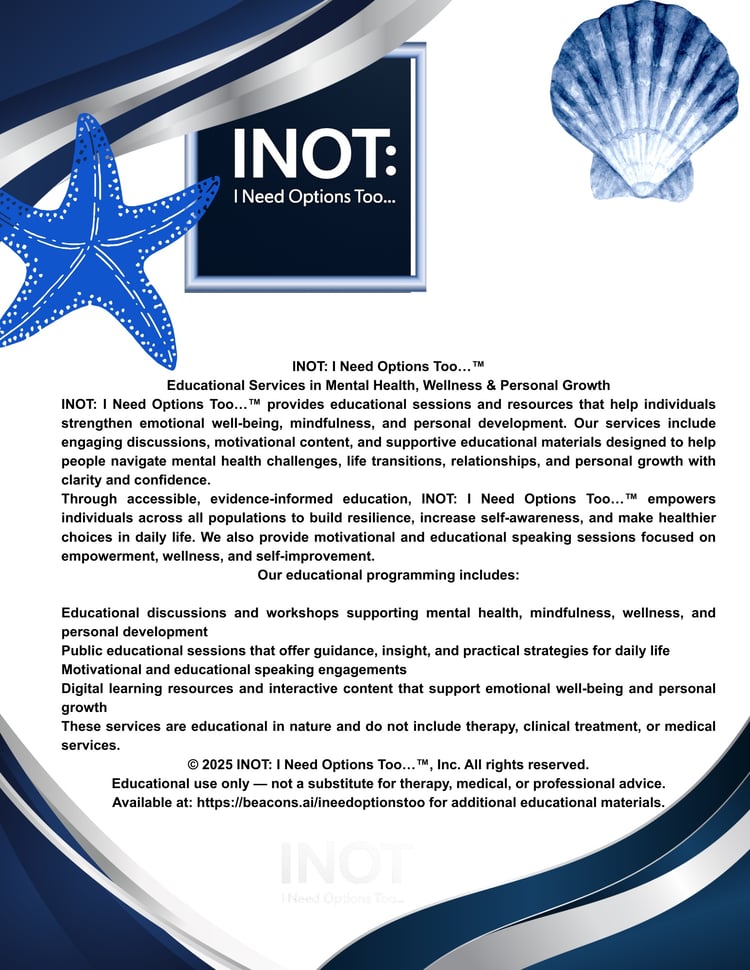 INOT: I Need Options Too…™, Inc. All rights reserved. All content provided by INOT: I Need Options Too…™ is strictly educational and informational and is not a substitute for therapy, counseling, clinical care, medical treatment, or legal advice. INOT: I Need Options Too…™ provides non-clinical educational services and does not offer mental-health treatment or counseling. If you are experiencing a mental-health crisis, please contact a licensed clinician or call 988 (Suicide & Crisis Lifeline). By accessing, purchasing, or downloading any materials, you agree not to reproduce, distribute, or resell them without written permission.