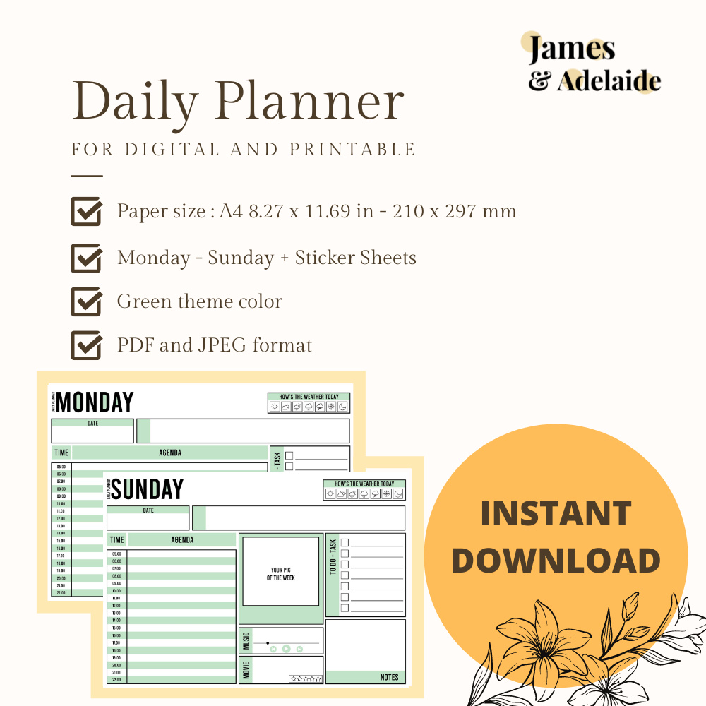 Daily Planner + Sticker Sheet - Green | for Digital Planner and Journal | Printable Daily Planner Sheet