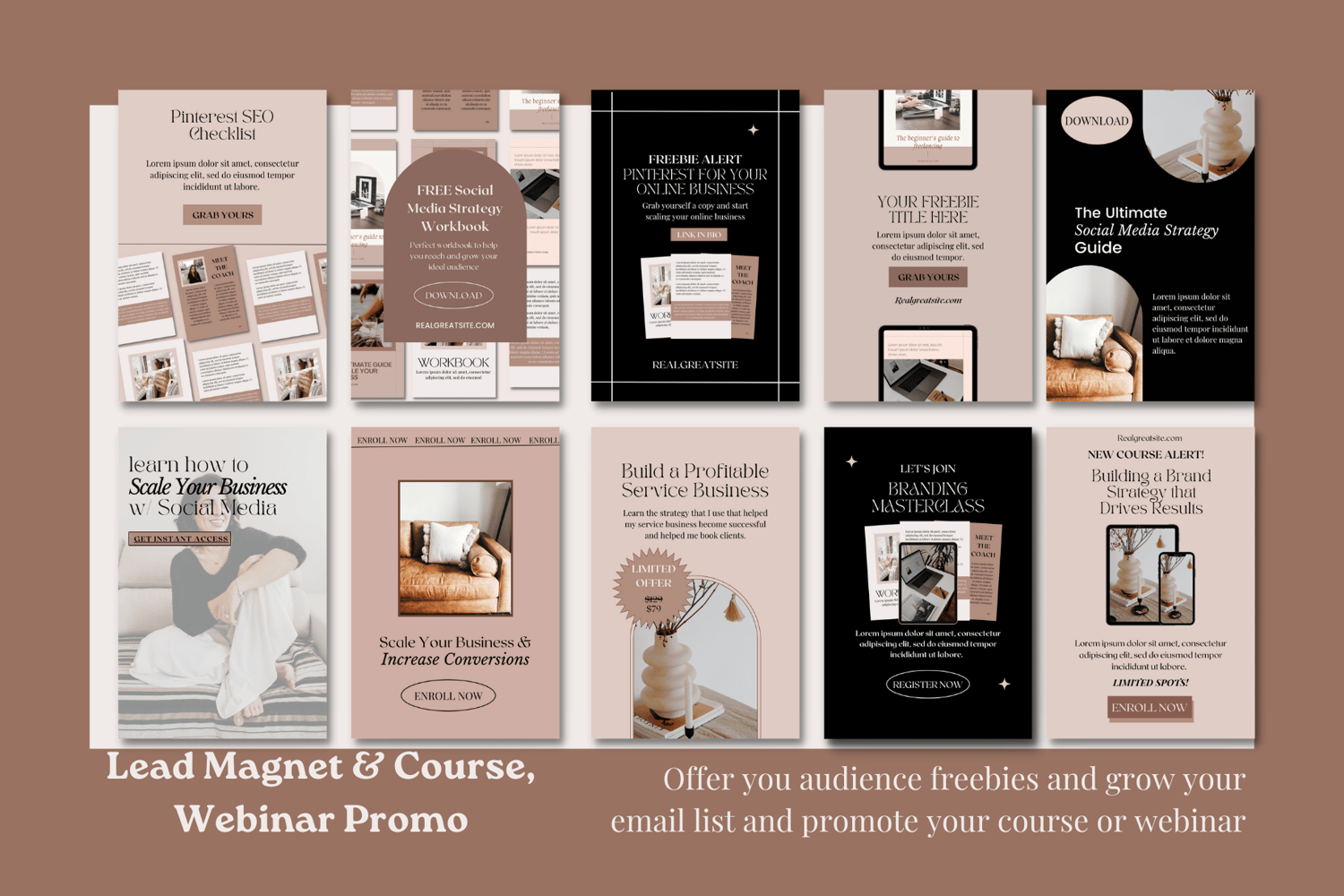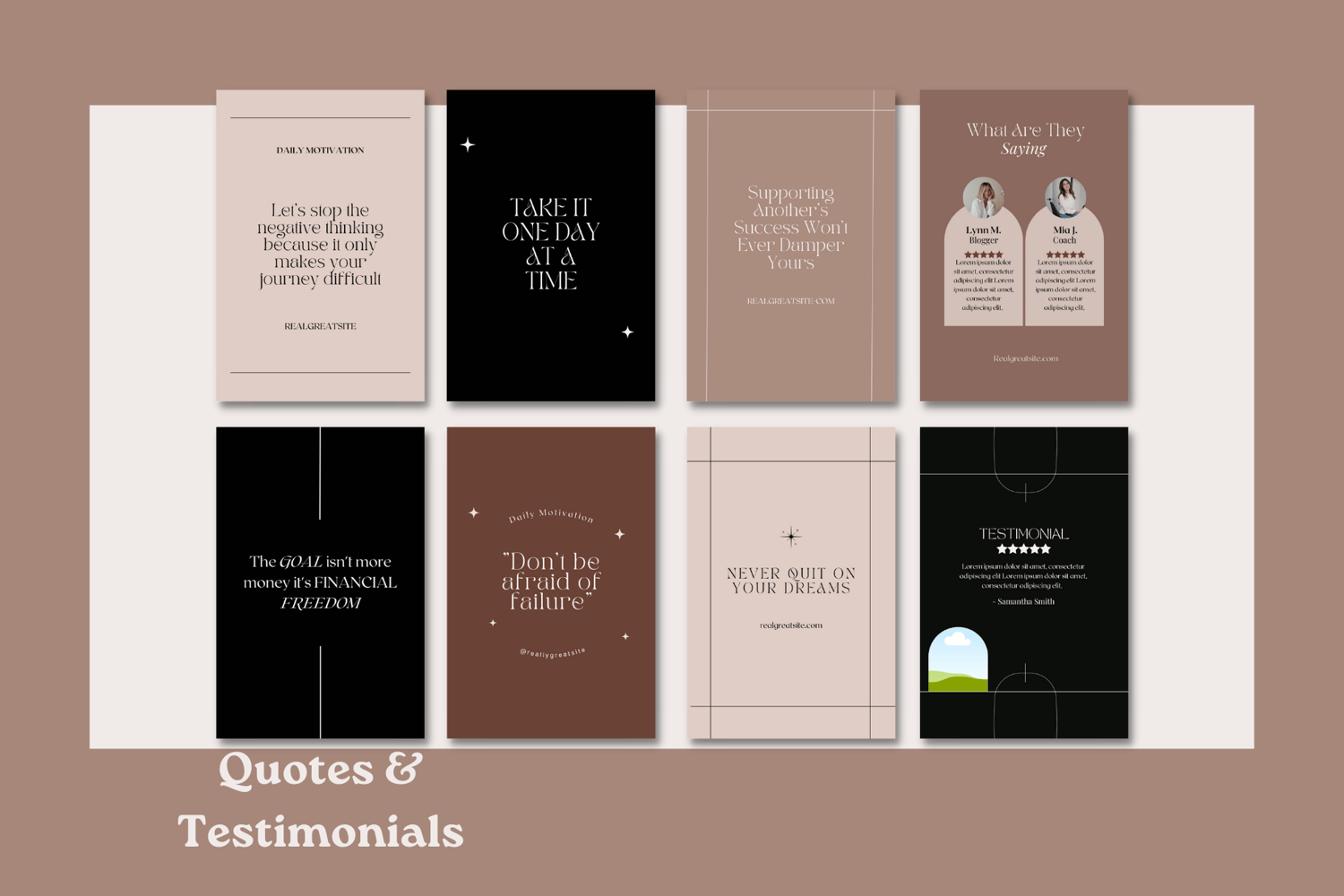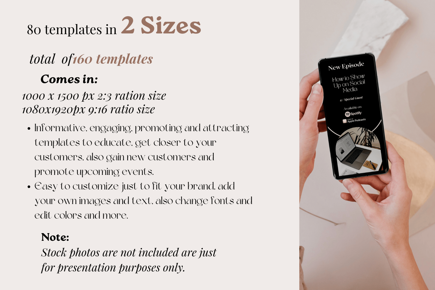 The perfect Kit for coaches, content & course creators, podcasters and entrepreneurs. It features 80 unique designs in 2 sizes - 1000x1500px 2:3 ratio size and 1080x1920px 9:16 ratio size and in total 160 templates.
