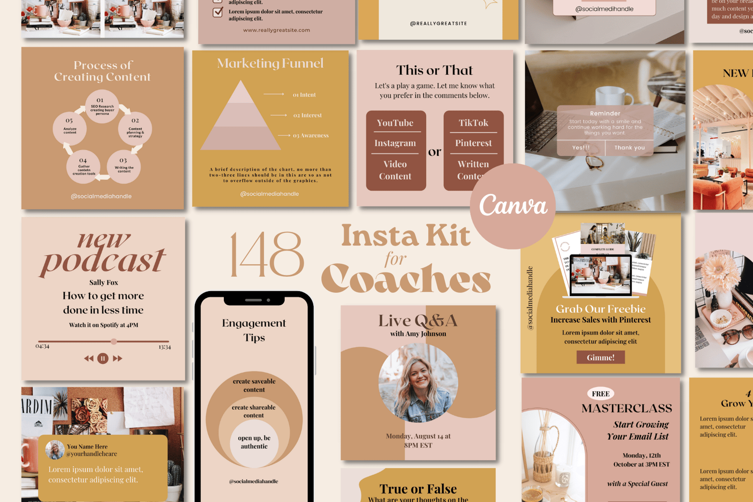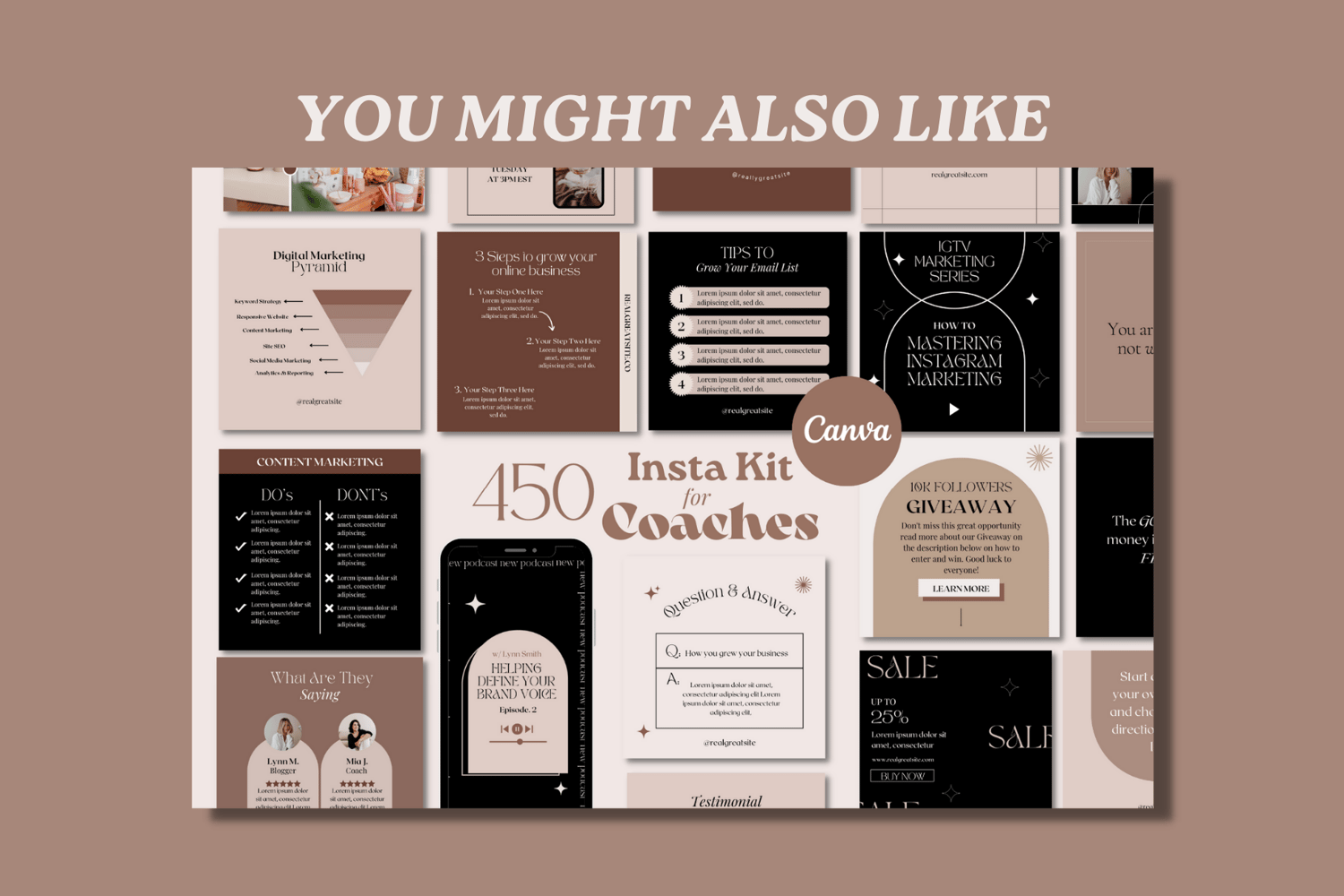 The perfect Kit for coaches, content & course creators, podcasters and entrepreneurs. It features 150 unique designs in 3 sizes - 1200x1200px for post; 1080x1080px for post and 1080x1920px for story - and in total 450 templates.