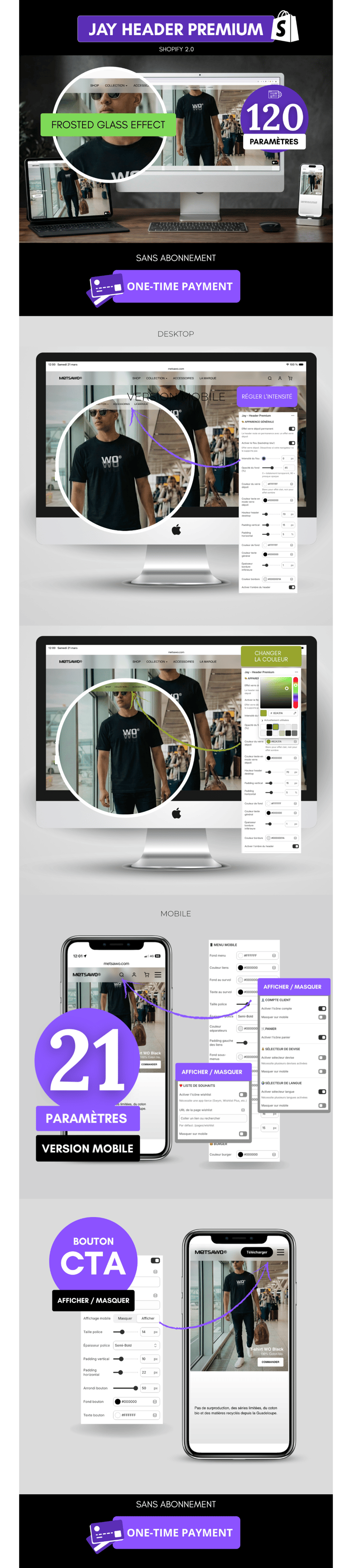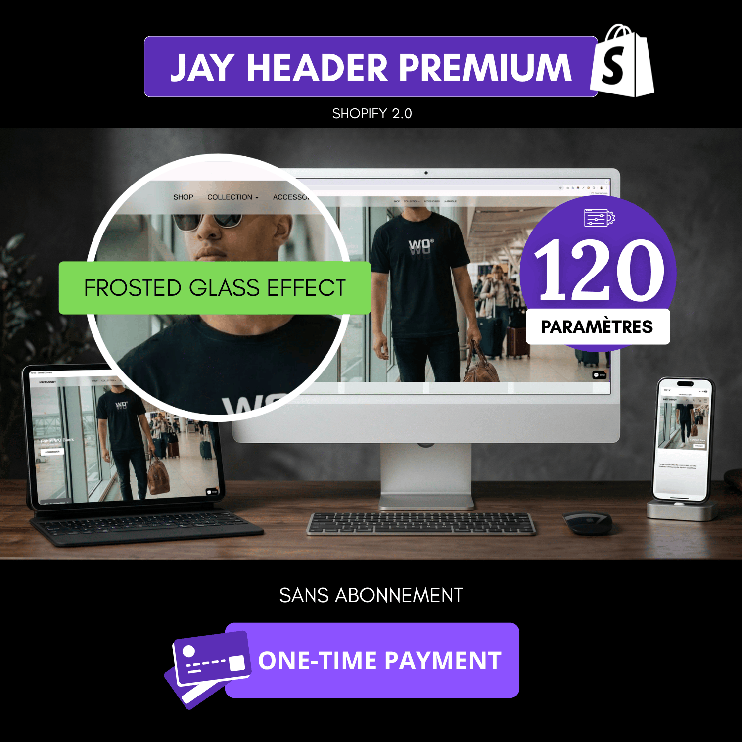 Remplacez définitivement l'en-tête de votre thème Shopify par une section premium, entièrement personnalisable depuis le customizer. Aucune ligne de code à écrire. Paiement unique, aucun abonnement.