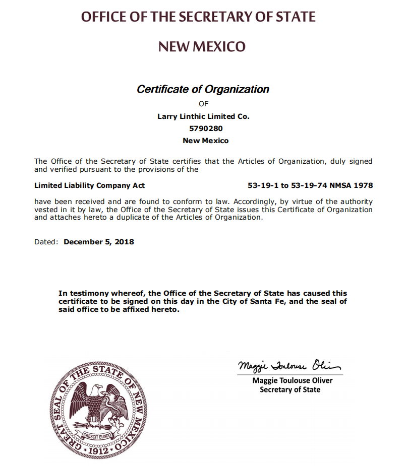 Larry Linthic Limited Co. is a U.S. limited liability company registered in the State of New Mexico.