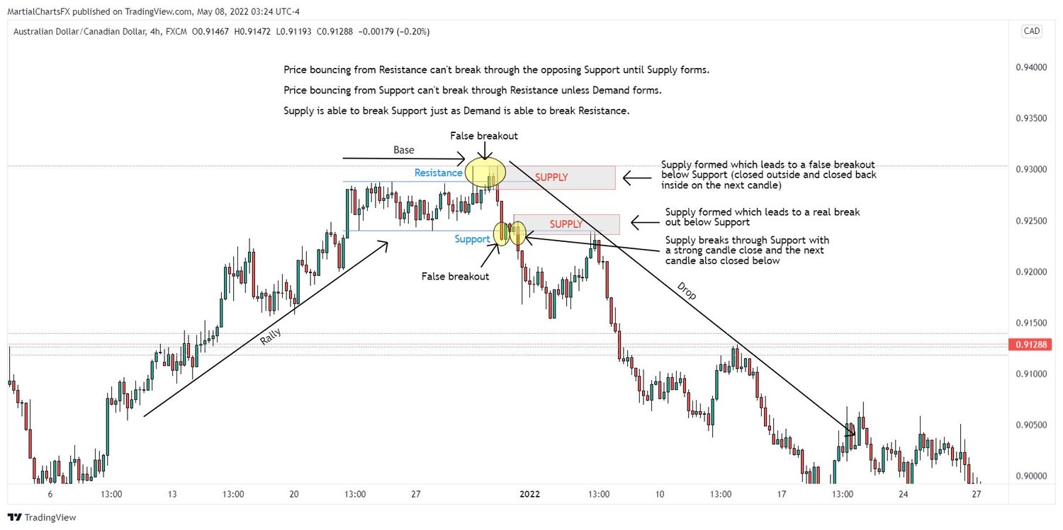 Example: If price rallies from Support it will not break through Resistance. Price will only break through Resistance if price is rallying from an area of Demand.