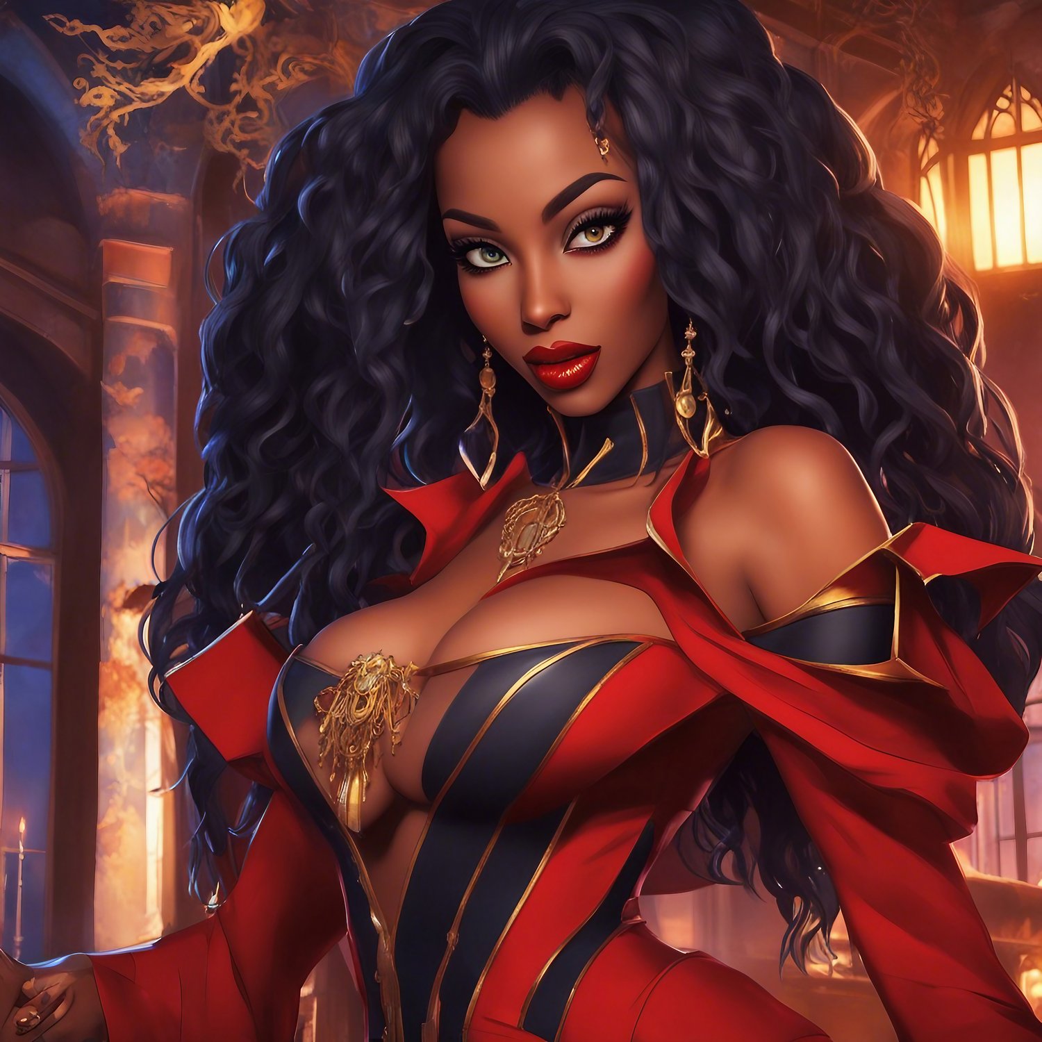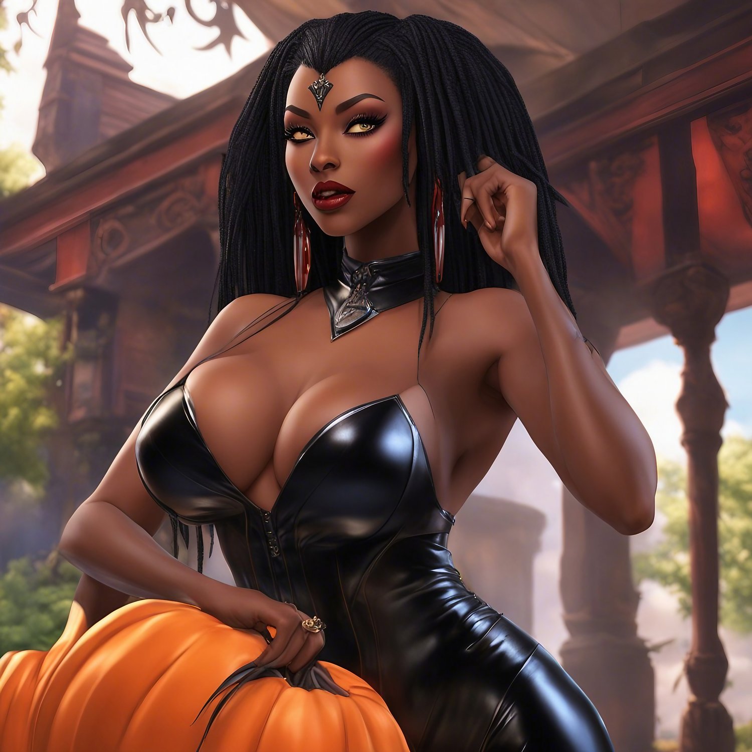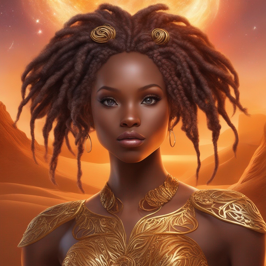 In a tropical paradise, Misti's vibrant attire and matching headscarf burst with eye-popping colors. Dangling gold earrings, each adorned with a jade stone, frame her captivating beauty, radiating an alluring and exotic charm.