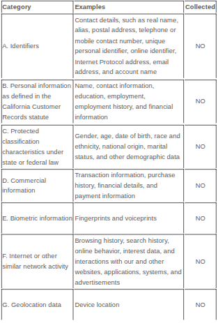 The table below shows the categories of personal information we have collected in the past twelve (12) months. The table includes illustrative examples of each category and does not reflect the personal information we collect from you. For a comprehensive inventory of all personal