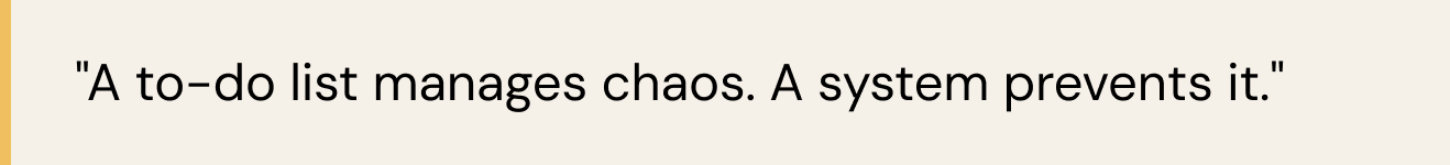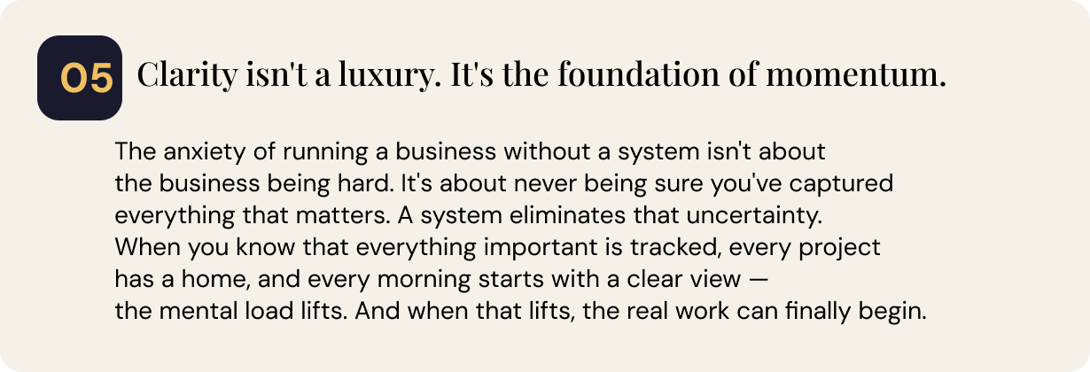 This is what experienced operators mean when they talk about "working on the business, not just in it." A system creates the visibility you need to make strategic decisions instead of reactive ones.