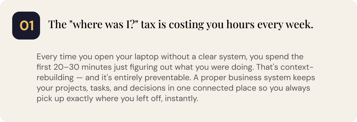 The most successful solopreneurs and creators aren't working harder than you. They're working inside a structure that makes every decision easier, every project trackable, and every morning frictionless. That structure is a business system — and if you don't have one, here are the five reasons you need to build one today.