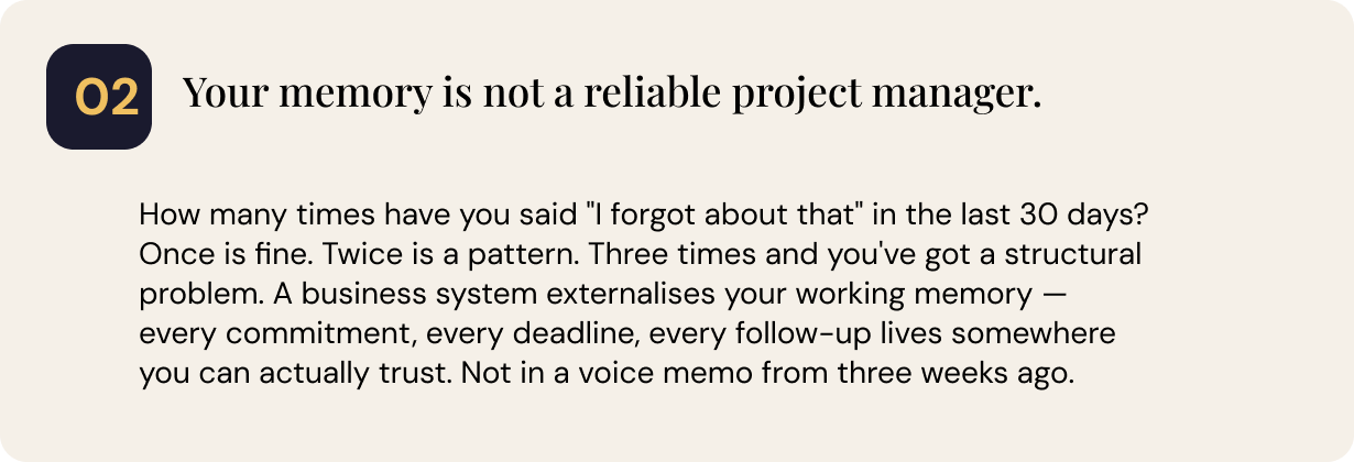 This isn't about being disorganised. It's about the natural limits of human cognition. Your brain is brilliant at creative thinking, problem-solving, and big-picture vision. It is terrible at reliably remembering that you promised a client a draft by Thursday.