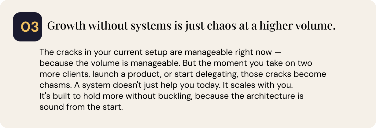 A solopreneur who builds a proper system can onboard a VA, hand off a process, or add a revenue stream without rebuilding everything from scratch. One who doesn't will have to pause growth just to catch their breath.
