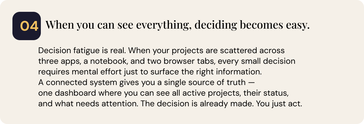 Not because you're lazy. Not because you lack ambition. But because your business is living entirely inside your head — and your head, despite its remarkable capabilities, was never designed to be a project management tool.
