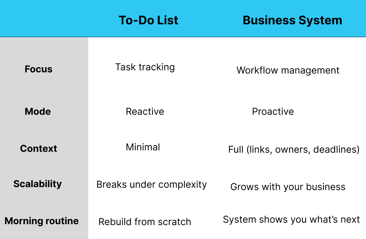 Most entrepreneurs and creators treat their to-do list as the foundation of their business. But a list is just a memory aid — it captures tasks without context, tracks activity without direction, and collapses the moment your business gets even slightly complex.