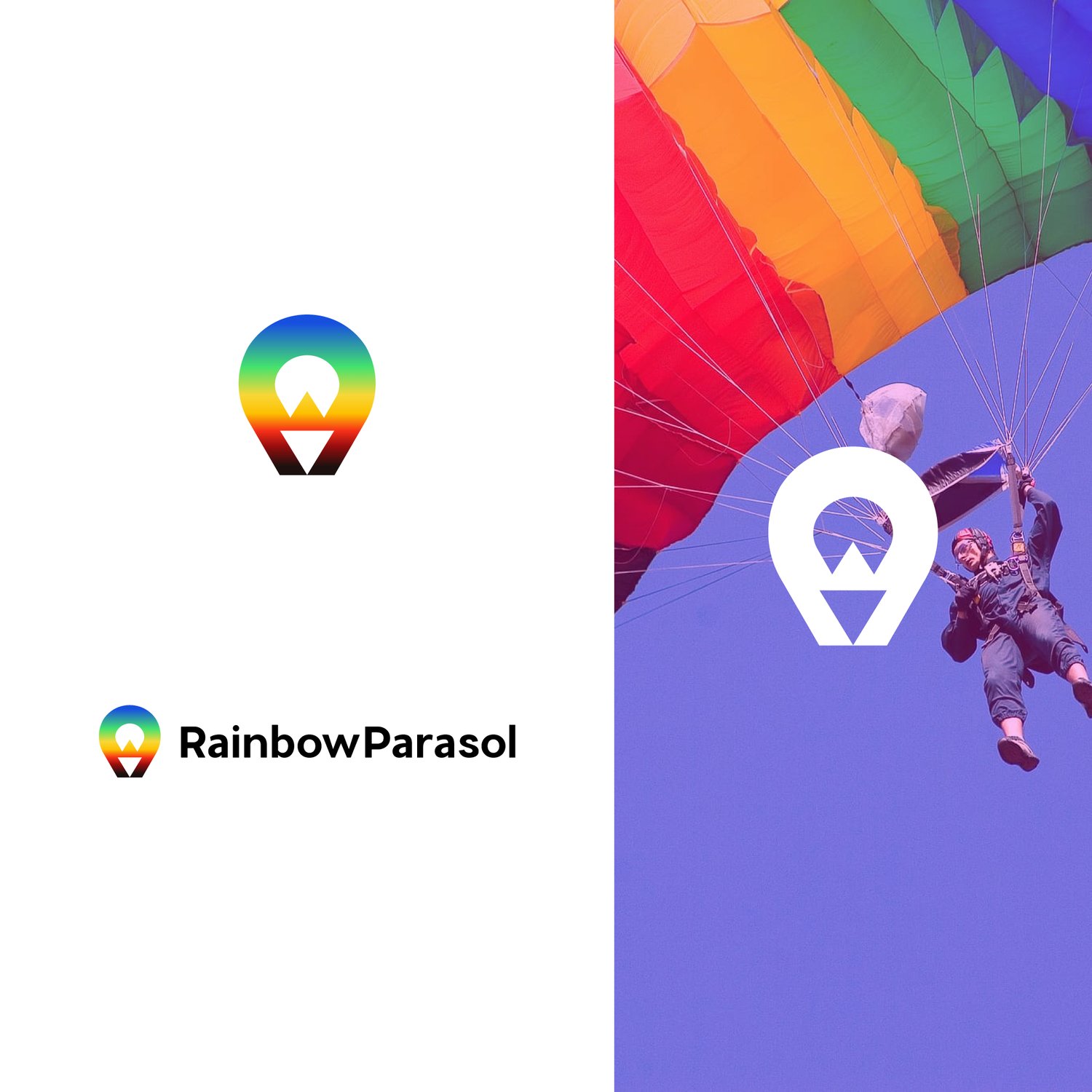 RainbowParasol logo, parachute, blue, sky, clouds, people