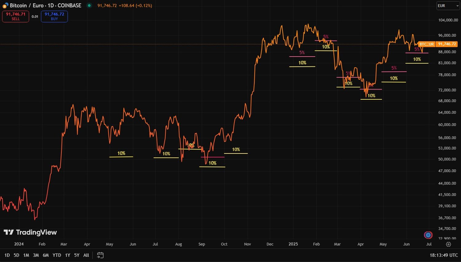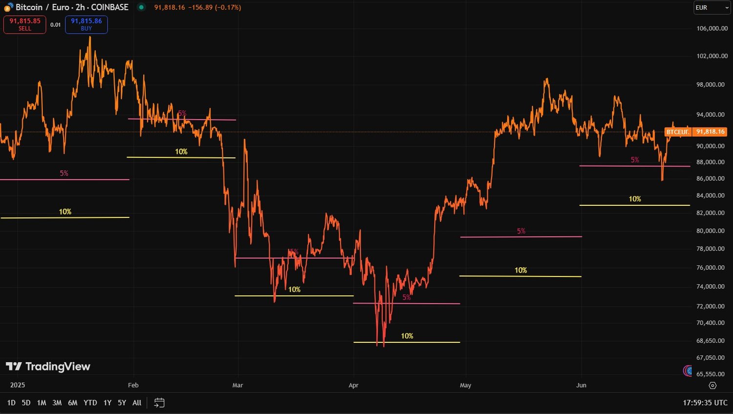 Let's say we wanna hit a bitcoin price drop of 10% of the pre-month average price as buy order limit. This is how it looks for 2025 and 2024. The dips of the year got hit. The question is, is this speculation more worth than dca directly? Or does it makes sense to dca and hold back a buy order amount, if it hits -10%?