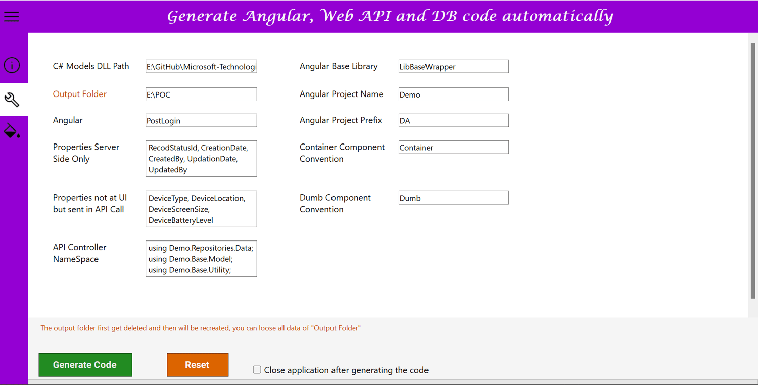 Welcome to our innovative code generator that streamlines your development process for Angular, Web API, and database applications. With our cutting-edge tool, you can automate the creation of code snippets, saving you valuable time and effort. Whether you're a seasoned developer or just starting out, our code generator is designed to simplify your workflow and enhance your productivity.
