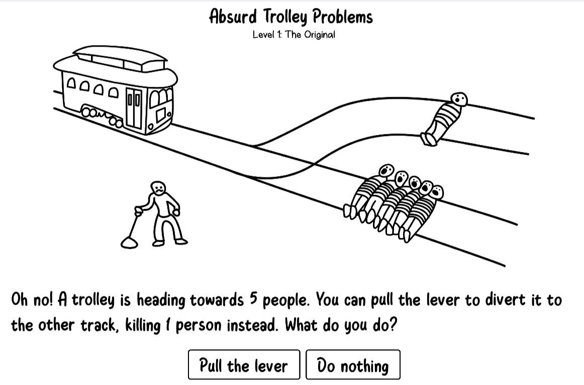 Each time you make choice you see some data about the number of people who made the same choice and then the problem moves on to a more complex one. https://neal.fun/absurd-trolley-problems/