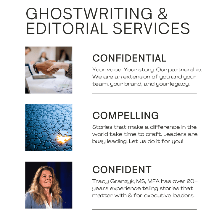 Tracy Granzyk, MS, MFA has over 20+ years experience telling stories that matter with & for executive leaders.