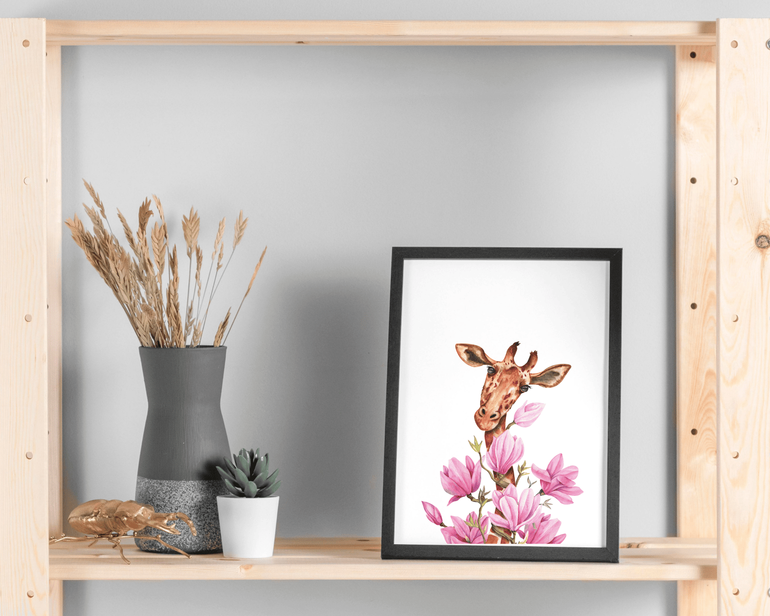Cute and Funny Looking Giraffe Peeking Behind a Magnolia Bush-Beautiful Funny Animal Prints for Home Decoration or Office Wall Art-Funny Prints for Wall