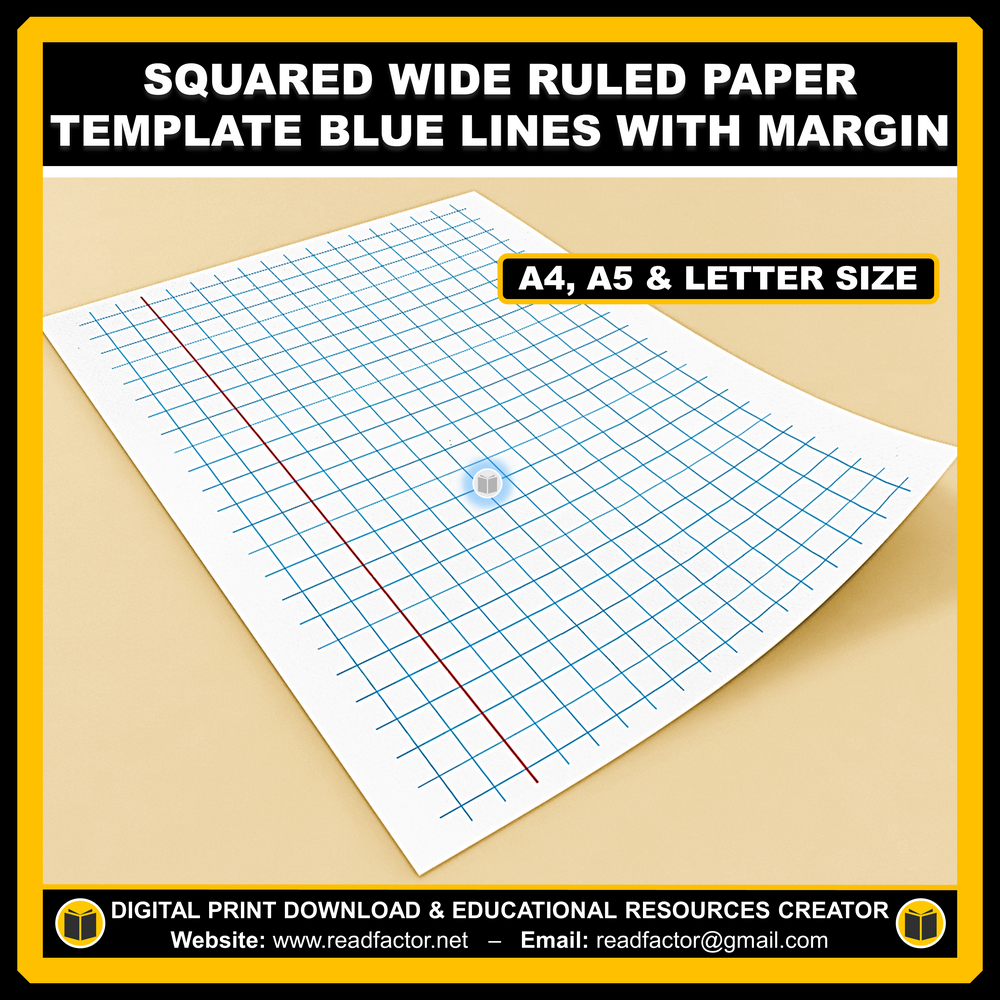 Squared Wide Ruled Paper Template Blue Lines With Margin - A4, A5 & Letter Size